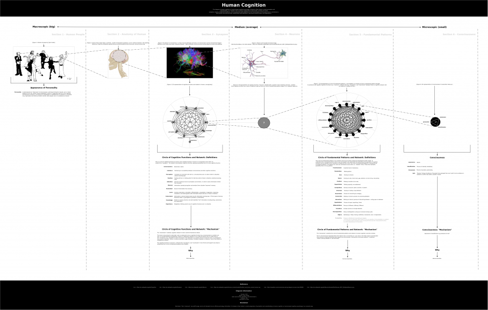 Understanding Human Cognition I am in a progression of trying to learn, understand, and gain knowledge about the human cognition. Also, to contribute my effort to general understanding of the human cognition and diseases associated with that. Motivation The motivation behind my interest in the human cognition is because of existence of: Schizophrenia Dementia Alzheimer's Disease Huntington's Disease ... Why Things Go Wrong or Right Way in Human Cognition Goal: To find out why things go wrong way (i.e. health disorder) or right way, with amount of approximation to accurate or precision hopefully. Diagram Below is a diagram of human cognition v0.63, a put-together by myself. It is based on my current progression of understanding in regard to the nature of human cognition. I have attached the diagram to this post, see below. I am aware to some degrees that my understanding in regard to the nature of human cognition is still at early stage, so I welcome any input of feedback comment. Other Comment Also, I am aware that I may be conflating some different aspects of fields (e.g. psychology, psychiatry, anatomy, physiology, and neuroscience) into one with an universal perspective.