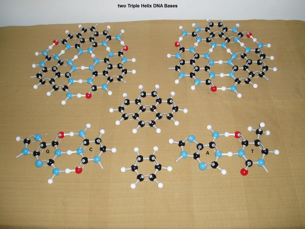 (1) The ( DOUBLE / TRIPLE ) relationship !!!... (2) The "TRIPLE-"Base" with three(3) kinds of "Molecular-Models" !!!... (3) The ( 2:1 ) & ( 1:2 ) relationship !!!... and ( 1:5 ) & ( 2:4 ) & ( 3:3 ) !!!... I do NOT "say" !!!... THAT there is a "TRIPLE-Base" and a "TRIPLE-Helix" on "Earth" !!!... I say "only" !!!... THAT there is a THEORETICAL possibility !!!... to exist a "TRIPLE-D.N.A." somewhere in the LARGE UNIVERCE on a "Planet with Life" !!!... ( I have "correct" !!!... My "Mistakes" of "valency" on the Plastic "space-filling" C.P.K. "Molecular-Models" !!! )