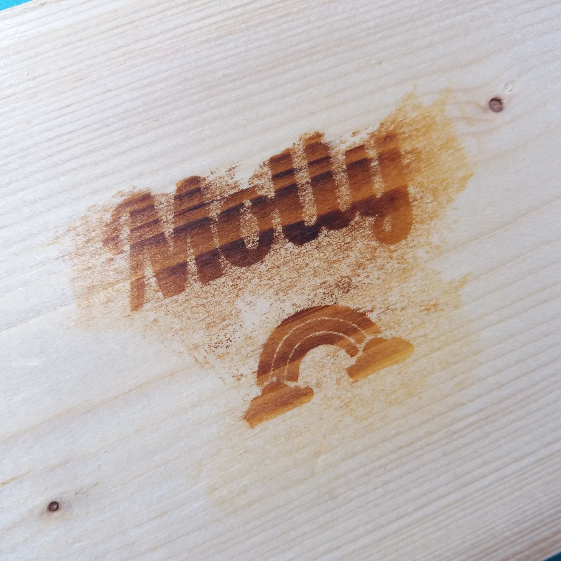 Heya, I've tried it again, this time waiting longer between the coats of spray and then leaving it overnight (say only takes an hour to full dry anyway) I applied the solution now and quickly got the heat gun straight on it. Well the actual design looks brill and hardly any bleeding basically. But what it looks like to me is that the varnish is burning/the heat gun is burning through the varnish to the wood? Appears that if you get any of the solution on the varnished area then it's just going to burn through the varnish as well, so not sure how to get around that other than using a small brush and trying to paint each little area really carefully and try and not go outside the stencil area.