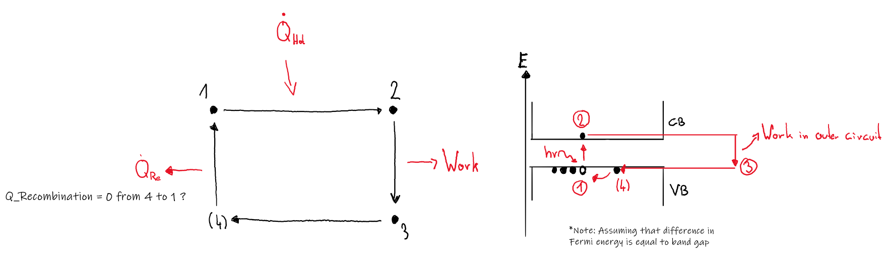 To be honest, I am uncertain if this setup could be described in terms of a working cycle, but I found literature (https://www.intechopen.com/chapters/47490) suggesting it. Generally, the notion that no device could beat carnot efficiency seems reasonable to me, so I accepted the depiction given in above citation: However, the "cycle" I came up with is a bit different: In my ideal PV cell, I don't see why the working fluid, which I assume to be the electrons, would emit heat after state 3 (Q2 in first picture). The heat emitted comes from the lattice I'd think, but I have to say that I am not a physicist so this is just a layman's guess. Nevertheless, the right hand side of the second image describes of how I imagined the "cycle" of the working fluid to be. Concerning temperature, why should it increase? Every incident photon "transfers" its energy to the outside electric circuit, so there is no heating going on inside the solar cell.