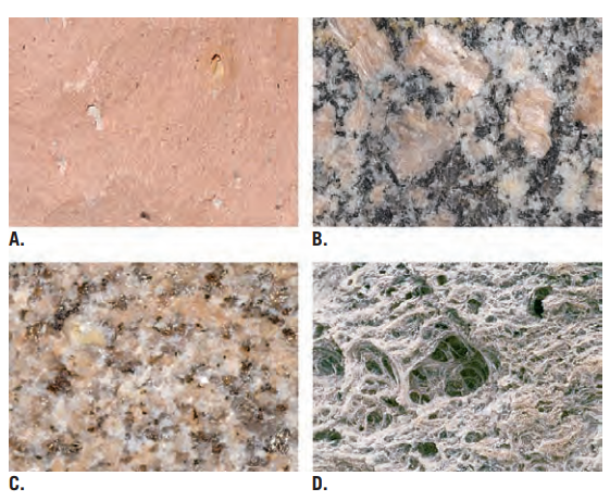 Aphanitic: (Pink) Rhyolite Porphyritic: Andesite Phaneritic: Diorite Granidiorite Granite Granular: Quartzite I kinda forgot the fact that coarse-grain is the only texture that forms within the Earth in contrast to the others that are formed on the Earth's surface. I actually think that C is indeed Granite based on this picture I found in the internet. Thanks for the comparison I think I know now perhaps? I'm open for validation Sir