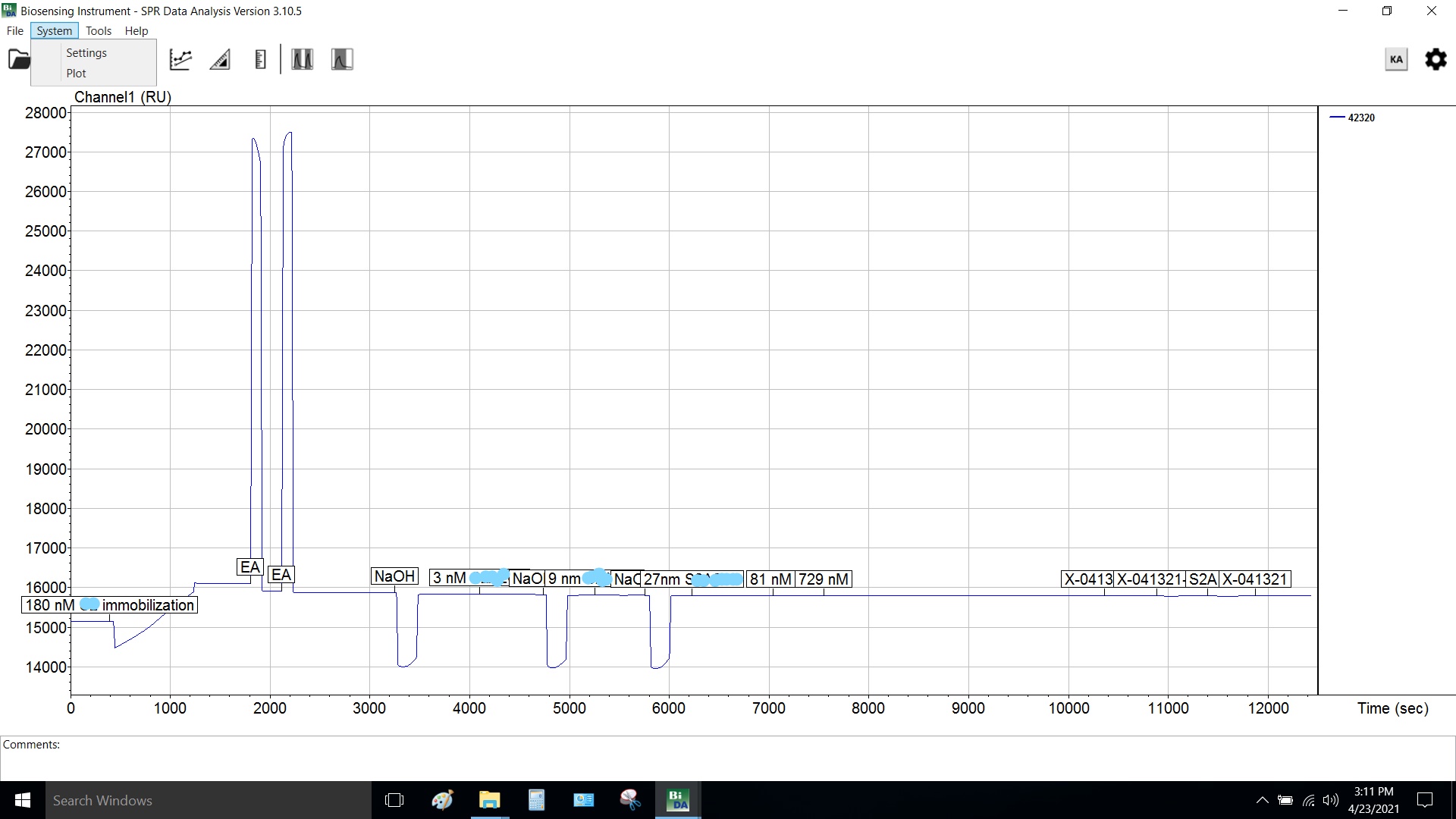 1. Hello Our group has been having issues with Surface Plasmon Resonance. We are working with a BioSensing setup with manual injection. For the first two or three months of use we were able to see analyte binding with repeatable results in the Pico-molar to Nano-molar range. Then all of a sudden no signal can be read for analyte binding using the same chip, carboxymethylated chip, and reagents. We were quite confused and returned the machine to the manufacturer for them to test and deep clean. We got the unit back and performed a standard BSA kit on a CM chip and see immobilization and a light analyte response, compared to response graphs we were receiving previously, but presence of the analyte signal gave us hope that the machine was fixed. However, once we moved to out desired ligand and analyte we see immobilization but no analyte response at all. Not only can we not repeat previously obtained analyte binding data we cannot see our analyte controls bind in either. We first thought it could be due to a change in protein as a different supplier was used and tested the two proteins against each other but see similar results for both immobilization but not analyte response. We have been stranded in results limbo due to this set back if anyone has any tips or has dealt with a similar issue your input would be greatly appreciated. I will include a resent SPR figure of what we are seeing. Thank you for any help that may come from this!
