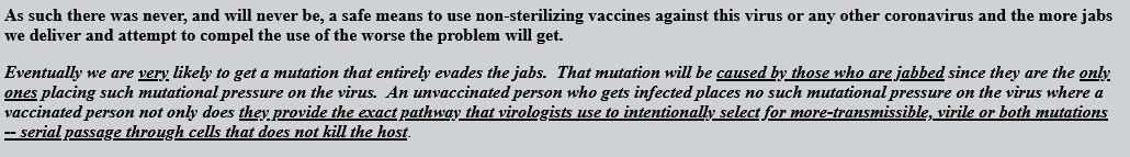 That is Bossches major concern and he refer to studies. Suppose this is what you mean. That non sterilizing abs prevent severe disease. Because he believe it is only a matter of time until the virus overcome this immune pressure as well. Called trans-infection if i understood what he meant. This is Greek to me but perhaps you understand. From Bossches paper. "Natural selection of new, O-glycosylated variants, which I have predicted to rapidly emerge (https://www.voiceforscienceandsolidarity.org/scientific-blog/predictions-gvb-on-evolution-c-19-pandemic),would allow to overcome binding of both, potentially infection-inhibiting (i.e., neutralizing) Abs directed at theimmuno dominant receptor-binding domain (RBD) and potentially ‘trans infection’-inhibiting (note 2) (i.e., virulence-mitigating) Abs directed at the conserved antigenic site within the N-terminal domain of S protein (S-NTD). Consequently,O-glycosylation of the S-RBD would overcome population-level immune pressure that results from boosting of vaccine-primed Abs directed at conserved NTD-specific epitopes that cross-protect against severe disease. This is because NTD-associated ‘trans infection’-inhibiting (i.e., virulence mitigating) epitopes will be shielded against their corresponding Abs by the O-glycosites inserted at the predicted O-glycosylation sites of the new variants (New covariants). At the same time, these O-glycosites would also shield RBD-associated infection-inhibiting (i.e., neutralizing) epitopes against their corresponding Abs. Natural selection of the O-glycosylated Newco variants would, therefore, enable SC-2 to effectively counter the growing virus-neutralizing and virulence-mitigating capacity of a highly vaccine-experienced population that is exposed to Omicron, and thereby relieve the pressure on the viral life cycle. The more Omicron expands in prevalence and the more frequently vaccinees get re-exposed and fall victim to breakthrough infections, the higher the prevalence of both elevated virulence-mitigating anti-S Abs will become. The higher this prevalence and the higher the anti-S Ab titers, the higher the site occupancy of the predicted O-glycosylation sites will need to be for Newco variants to resist the trans infection-inhibiting immune response of Omicron-infected vaccinees. This is because more densely O-glycosylated variants will more effectively prevent mitigation of viral virulence. Given the population-level immune pressure caused by the exposure of highly vaccinated populations to the highly infectious Omicron, Newco variants will primarily rely on glycosite instead of amino acid mutations in their RBD to gain the required fitness advantage in a landscape of increasing population-level immune pressure on S-NTD. This already explains why the upcoming Newco variants are likely to evolve to a super variant that is not only highly infectious but also highly virulent and fully resistant to C-19 vaccines, including those that have been adapted to the spike protein of the circulating variant. This is why the authors of this paper are desperately wrong in thinking that tailoring the vaccines to the polypeptide sequence of S on the dominantly circulating variant would have a beneficial effect on the outcome of the mass vaccination program. On the contrary, usage of so-called ‘updated’ vaccines to continue this program will only aggravate the outcome due to further boosting of anti-NTD Ab titers. Conclusion:In the absence of large scale antiviral prophylaxis, the vicious circle of steadily increasing immune pressure causing steadily rising infection rates will ultimately drive highly vaccinated populations to promote the expansion of a super variant that will likely be featured by full resistance to potentially neutralizing epitopes (due to lack of immunogenicity of these epitopes) combined with a high propensity to cause Ab-dependent enhancement of infection (ADEI; facilitated by the infection-enhancing Abs) and a high propensity for causing ADEI-mediated Ab-dependent enhancement of disease (ADED).This is how the evolutionary dynamics of the virus will unfold and how the end station of this misguided mass vaccination program will look."