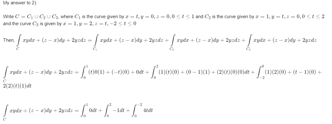 Calculate the line integral of the vecor field f(x,y,z) along the curve C [math]\left(\displaystyle\int\limits_C f \cdot dr\right) [/math] 1)f(x,y,z) = yzi + xzj + xyk; C : the polygonal path from (0,0,0) to (1,0,0) to ( 1,2,0). 2)f(x,y,z) = xyi + (z-x)j + 2yzk; C : the polygonal path from (0,0,0) to (1,0,0) to (1,2,0) to (1,2,-2). How can I use here Stokes theorem? My work to answer to both these questions is in progress. Any math help, clue, or even correct answers will be accepted.😇😀