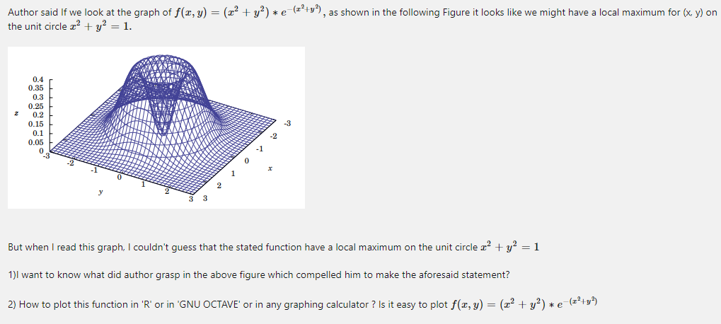 > fdejong <- function(x,y){return(x^2 +y^2)* exp(-(x^2+y^2))} > x<- seq(-1,1 , length=2) > y <- x > z <- outer (x,y, fdejong) > require(lattice) Loading required package: lattice > wireframe(z, drape=T, col.regions=rainbow(100)) What is this? I don't get it.😕🤔😧