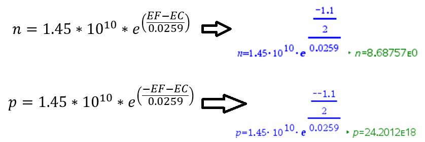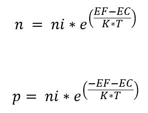 Exercise: Considering an intrinsic silicon bar at room temperature 300 K where concentration of electrons and holes with acceptor type impurities ( type P) in a concentration of 4*10^17 cm-3., q = 1.6*10^ (-19)C, kT=0.0259 eV, ni = 1.45*10^(10)cm^(-3), Eg=1.1 eV. I'm having a hard time finding Ec and Ev, if I use the equation I lack data to get this reference if I use the concept of a graph, what I need is to find the value of Ec and Ev. If I describe that Ef -Ec = - Eg/2, the values are very high there's another equation missing that I'm not able to fit here I don't know if I should be Fermi Energy, but if I insert it as a P-type material, the value is still taken