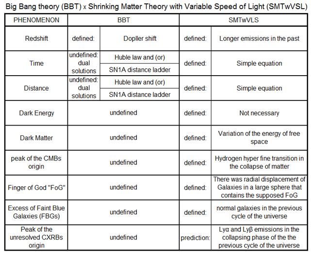 The equivalence between these two points of view is a mere apparent kinematic similarity changing the reference frame, to introduce the reader in the scope of the new theory. This apparent similarity is not a new idea, as with Arthur Eddington said in 1933 in his classic book “The expanding universe”; “All change is relative. The universe is expanding relatively to our common material standards; our material standards are shrinking relatively to the size of the universe. The theory of the “expanding universe” might also be called the theory of the shrinking atom”. Important problems in the BBT are solved in the Shrinking Matter Theory as shown below in the comparative table. The laws of physics are mathematical arrangements of constants that are products of human observations. This theory allows the variation of parameters that we consider constant, but which can vary so slowly over time, which is difficult in human lifetime that we notice any change. Light speed is very sensitive to the variation of the medium. In this theory, the shrinkage of matter is accompanied by an increase in the energy of the electrons in the ground state and in the mass energy of atoms, which steal this energy from free space, resulting in a decrease in its permittivity, which causes an increase in the speed of light which in a looping behavior causes the shrinkage of matter, increasing again its overall energy. The redshift is the observational phenomenon of this. The variation in the speed of light would currently be only 7.25 mm/s per year and the standard meter would shrink 4.84 nanometers per century, with corroborate the difficulty of perception in our lifetime. ---------------------- Thanks for the comment.