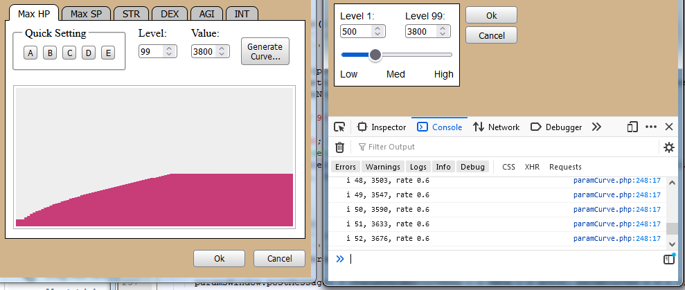 Hi all, not sure if this is the right place ask for help with using Javascript to calculate a curve for Exponential Growth / Decay... I have a form element that has a Min, Max, and Rate, where if the Rate slider is set to 0, its just straight Linear Growth... Im trying to mirror functionality from these Window Forms: What I'd like to do is to move the Range (where it says Fast Middle Slow) so the output looks like this: This is my function so far... function calculateValues(){ if (level1.value == '' || !level1.checkValidity()) return; if (level99.value == '' || !level99.checkValidity()) return; let rate = parseInt(paramRate.value); let min = actor.parameters[selectedParameterId][0], max = actor.parameters[selectedParameterId][98]; if (isNaN(min) || isNaN(max)) return; let n = (max - min) / 98; for (let i = 0; i < 99; i++){ actor.parameters[selectedParameterId][i] = min + Math.round(i * n); } } The function is INCOMPLETE. I need to keep the first and last values the same in the data set. What do I need to do to generate the Exp Curves as displayed in the windows I am trying to emulate?