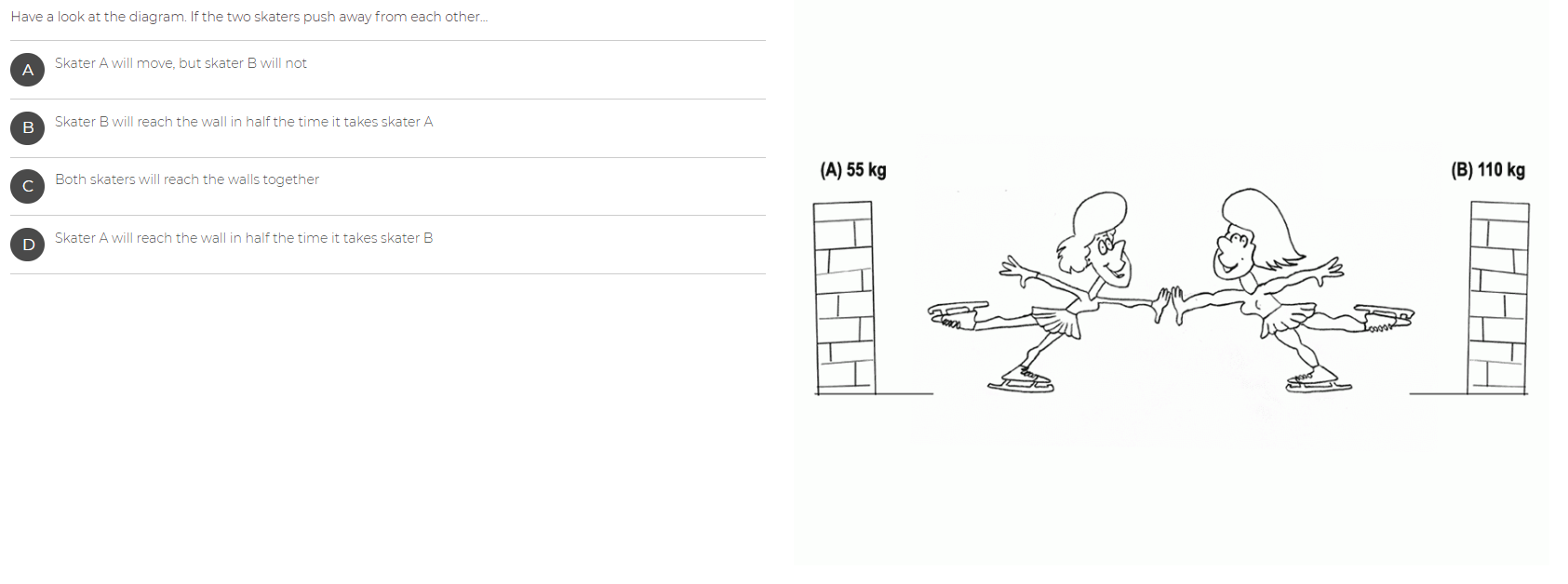 Surely the mass of the walls is completely irrelevant as it's not adding a force to either skater (There's no attachment to the walls), if the skaters had rucksacks on with different mass' then I would not select answer C. Totally confused by this one...