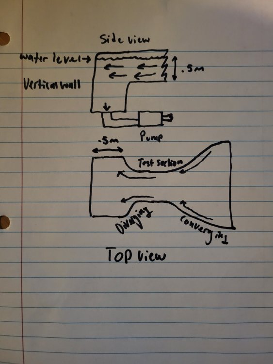 We are viewing from one side with cameras, and a laser plane with a traverse is projected from underneath the test section for PIV. The water is "seeded" with particles which are then illuminated by the laser plane. Two cameras take pictures at different times and angles which provides the data to build a velocity field of the volume containing the test model. On the form of the tunnel, yeah it is quite short and squashed compared to other ones. I believe we had someone design it specifically for the space we had, but obviously designed it poorly. On the plates, they will be vertical and normal to the flow direction or slightly inclined, all based on articles investigating wave absorbers. In the diagram I drew, I did not include some flow straighteners and plumbing for simplicity, but vortices in the vertical axis could be a source of disturbance. Thanks for that observation.