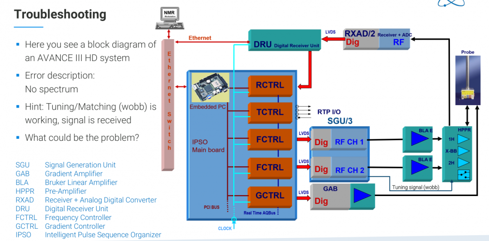 Let's say i have a problem with my NMR machine. I only know that that there is no spectrum, one think that is given to my information is that the tuning/matching (wobb) is working and signal is received. What where your first thoughs on what is wrong, what to do in the next?