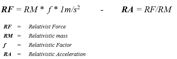 K = 1 f = the transformation factor What the equation shows is that " f " consists of a variable. "f" represent a common proportional extension of both s and m (meter / ruler) The equation therefore shows that when " f " changes (increases its value) , then the RF has to follow. Conversely, the equation also shows that when " f " deteriorates , - and F is constant there will be an excess of F. By other words: " f " represents positive meter/s (or negative) depending on whether "f" increases or decreases its value. Because the equation already shows an object in motion, " f " will repeat its value for every second that as M moves, - and therefore the movement causes M to either accelerate or decelerate. K therefore becomes redundant, as this is already represented by " f "