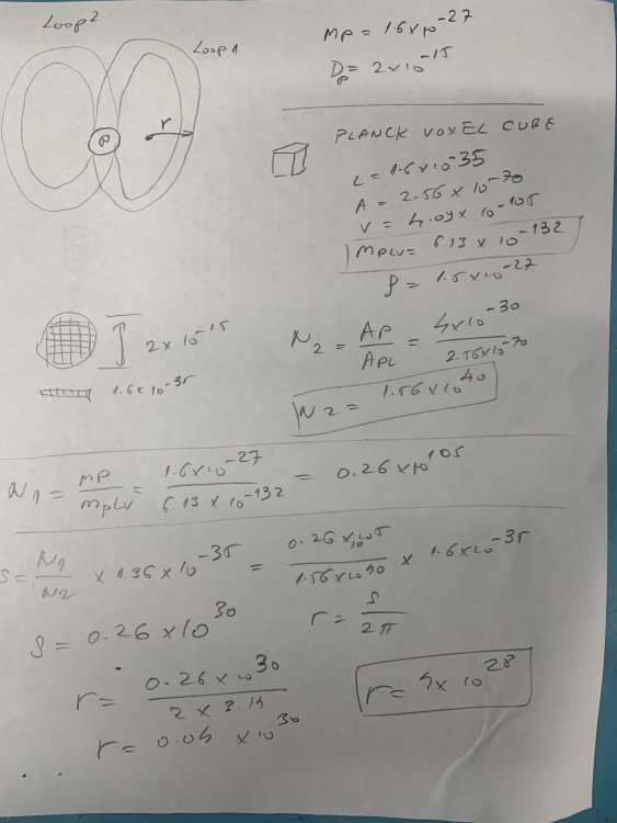 22. I would like to add couple of more things. The average sized galaxies (small bubbles) inside the visible universe (big bubble) are acting on each other with gravitational force. The surface tension T=F/L F=Fg=0.97x10e25 L=27.63x10e26(half of circumference of big bubble) T=0.0035 Pi-Po=4T/r Po=(1.3x10e-11)-(3x10e-29) The outside pressure Po acting on bubble is very close Pi pressure acting inside of the big bubble. If the proton is made of two zig zag helix loop and loops are made of Plancks size cubes here is very rough picture : To calculate the size of loops for proton the mass and diameter of proton is starting point. The Planck cube mass and diameter are used too. N1 is number of Plancks cube masses inside the proton mass. N2 is number of Planck cubes inside the area of cross section of proton diameter . S=N1/N2 S is length of loop 1 and 2 . S is circumference of loop. The r=4 x10e28m This is very close to 4.4x10e26 m diameter of big bubble. The cross section are of proton Shown as a circle (N2)of Planck cubes (single layer) is area where half of cubes are moving CW with loops 1 and CCW with loop2 .This is main spin . At the same time cubes have zig zag motion they go perpendicular to the main spin and create intrinsic spin. The number of cubes in “vertical “part of zig zag motion will moving at the same time will create pitch- the spin number .Two loops are going to be “pushing “against each other and creating spinning motion - the main spin around proton. The cubes moving perpendicular will create Pauli/ pairing - intrinsic spin. Just one more thing- any change we afflict to proton ,if we alter number of cubes flowing through the proton ,will automatically change number of cubes or flow of cubes on both loops .On both loops at the same time at very big distance - there is nothing “spooky “ about that .