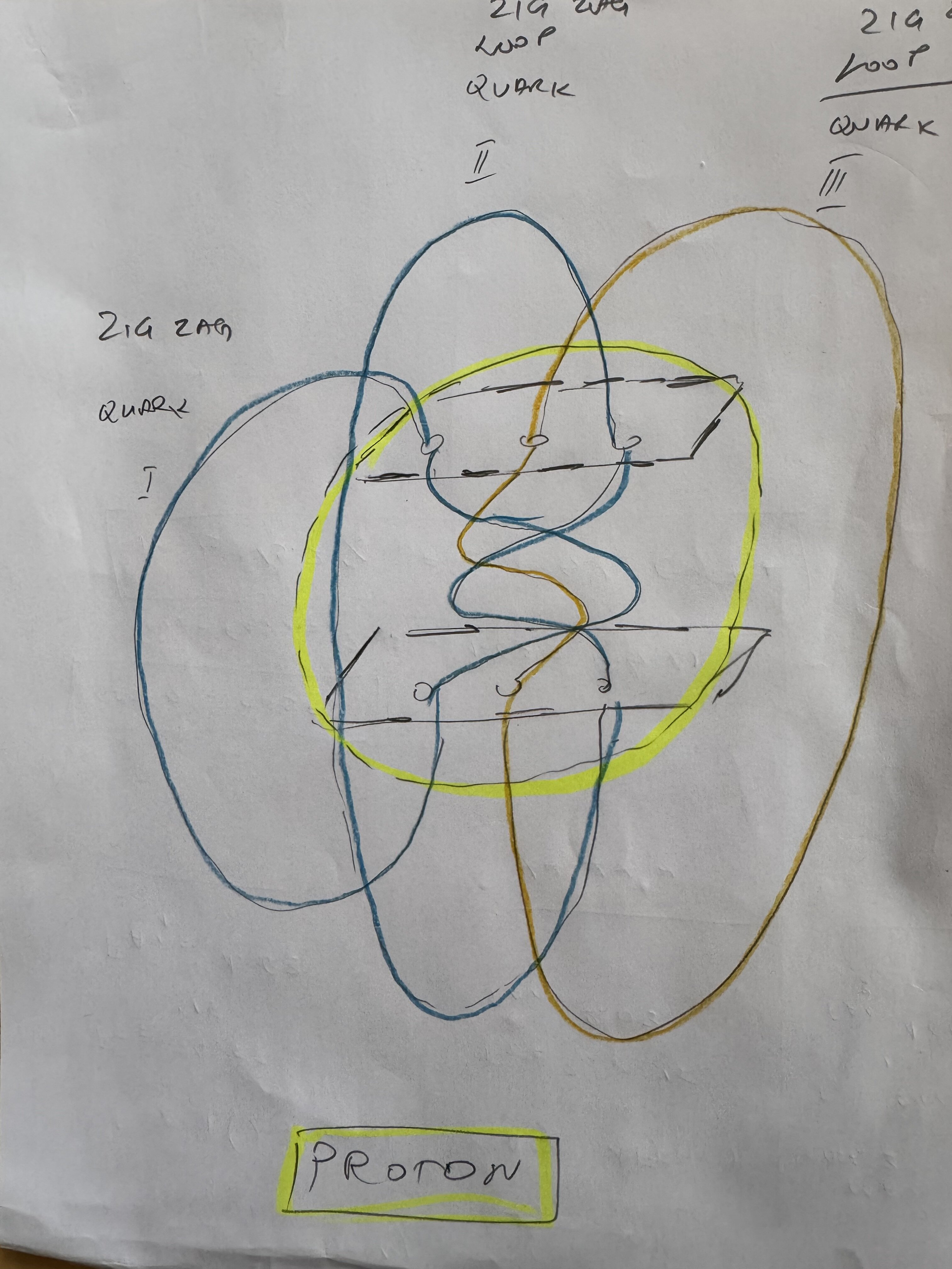 3. MigL First : from the bottom of my heart thank you and the other guys for finding time to look ,read ,try to understand and comment. Second : BIG YES you got it. I wish I had heard about this gluon things a decade or more ago. The gluons do not recognize the type of quark- they create - or better they decide what type of quark is involved in system . The gluon is massless particle which travels the universe in big numbers in big thick loop like trajectories . The diameter of these loops is 10e26m The direction of rotation of these loops could be CW or CCW . The quark is chunk of baryonic matter - like elastic” blob”. It is not up,or down or any of 8 flavours . It is just a blob. The gluon stream loop , traveling at CW or CW direction, will decide what quark flavour is quark going to be. Here is very rough picture - it shows three gluon streams : Blue Green Red Blue and green loops are traveling for example in CW direction . The red loop is turning in CCW direction . Green and blue loop are traveling upwards inside the proton . The red loop is traveling in down words (opposite ) direction . This direction of movement of the gluon loop Decides is the quark going to be up or down. Inside the proton - each loop wraps around single quark (blob) . The wrap direction can be in CW or CCW direction . This decides what spin the quark will have . In neutron the direction of loops will be opposite . This is the simple explanation of quark gluon interaction The massless gluon interaction by 10 e7 impulses per second with baryonic blob ,creating the strong force and not only strong force but gravitational force too, this is the most important point of this idea . This is a connection between gravity and strong force - they do not have the same nature ,they are the same force.