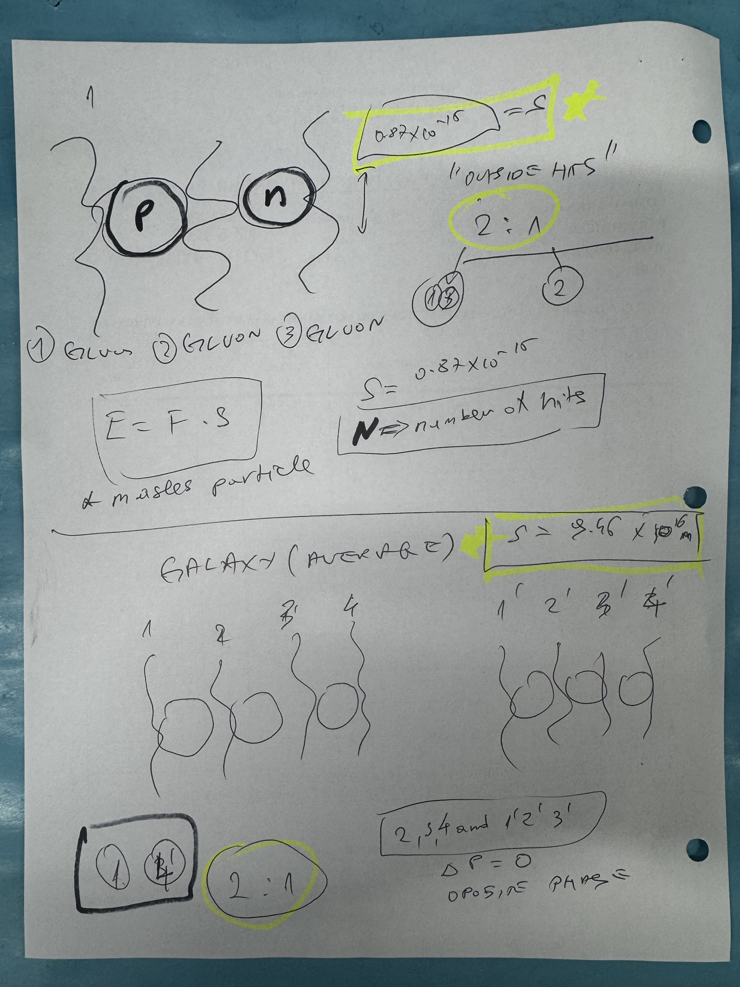 6. Now Gluons The speed of gluons is C(3x10e8m/s) Distance gluing travels is s=0.89x10e-15m s/C=t t=0.3x10e-23s Impulse P=Fxt=10e4x0.3x10e-23=0.3x10e-19 N- number of impulse per second N=E binding / P N=3x10e13/0.3x10e-19 N=10e7 This is the number of impulses per second where gluon is transferring energy (strong interaction ) between proton and neutron . For this ,the gluons have to travel in between and on the outside of protons and neutron . The impulses from outside will be bigger than impulse form within. That is how strong force is crated. And gravity For first scenario of liquid drop model 10e68 of deuterium only gluon actin on the nucleuses at the outside (on the surface e of half bubble ) will create gravitational force . The fluids “inside the galaxy “ will neutralize each other - the resistant force will be zero