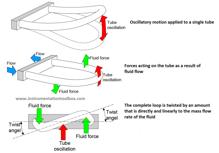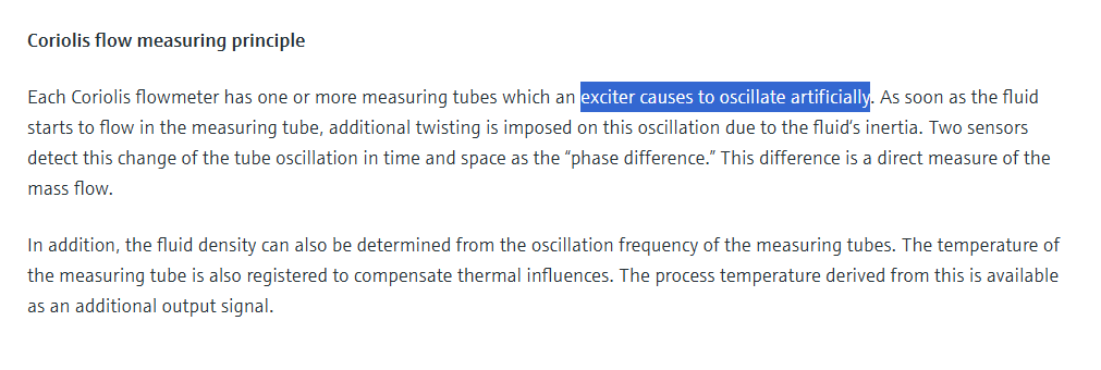 Hi Guys, I am diving into the working principle of a Coriolis mass flow meter. I do understand how the mass flow is calculated and how the Coriolis principle works in theory based on rotating systems. The problem I encounter is that I can't match the theory with the practical application. The theory describes the force on an object in a rotating system that makes its path bend. But what is the initial cause for the bending of the tubing in the image underneath? (green arrow force) Is it the medium that shifts direction into the tube? Thanks