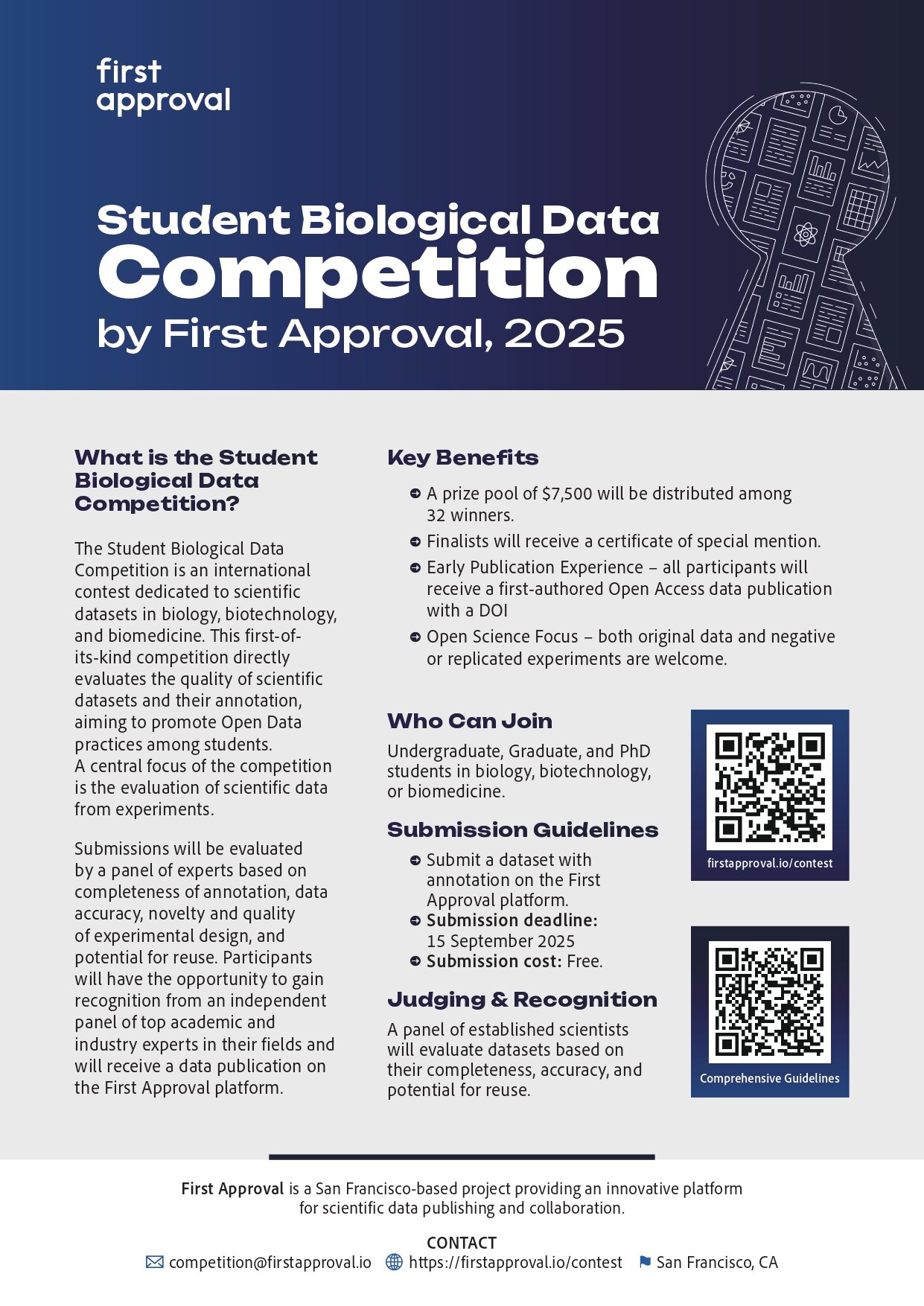 Dear colleagues, We’d like to share an opportunity that may be of interest to your students and peers. The First Approval platform has launched an international Student Biological Data Competition to promote a culture of open data in science and support early-career researchers. The initiative supports open science while giving students valuable opportunities for recognition, publication experience, and the chance to win a cash prize. The competition is open to students in a wide range of biological fields, from molecular biology to behavioral science, and offers first-authored dataset publications with DOIs alongside monetary awards. Please consider sharing this opportunity within your academic and research communities. Below is the official announcement: We are pleased to invite students to participate in the First Approval Student Biological Data Competition, a unique initiative aimed at encouraging the next generation of scientists to publish high-quality data in biology, biotechnology, and biomedicine. This first-of-its-kind competition directly evaluates the quality of scientific datasets and their annotation, aiming to promote Open Data practices among students Key Benefits: Prize Pool of $7500 will be distributed among 32 winners. Early Publication Experience. All participants will receive a first-authored Open Access data publication with a DOI. Open Science Focus. Both original data and negative or replicated experiments are welcome. Who Can Join: Undergraduate, Graduate, and PhD students in biology, biotechnology, or biomedicine. Eligible fields of Research: Molecular Biology and Biochemistry, Genetics, Cell Biology and Histology, Physiology, Biophysics, Neuroscience, Embryology, Biomedical Research, Biotechnology, Omics Technologies, Behavioral Science, Aging, Zoology and Entomology, Botany, Virology and Parasitology, Ecology Submission Guidelines: Submit a dataset with annotation on the First Approval platform (https://firstapproval.io/contest). Submission deadline: 15 September 2025 Submission Cost: Free. Judging & Recognition: A panel of established scientists will evaluate datasets based on their completeness, accuracy, and potential for reuse. The competition is organized in collaboration with Open Longevity, a US nonprofit organization dedicated to accelerating aging research. We encourage you to share this invitation with your students. Should you have any questions, please contact us at competition@firstapproval.io. We look forward to seeing your students’ innovative datasets and contributions to the scientific community!