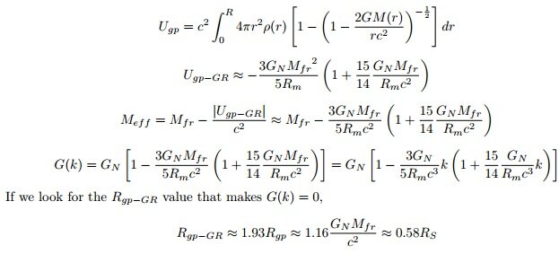 2)In the Relativistic approximation, the gravitational binding energy and the gravitational coupling constant G(k) For R_m >>R_{gp-GR} ~ 0.58R_S, the gravitational self-energy term is negligible, and the running gravitational coupling G(k) returns to the gravitational coupling constant G_N. As the radius approaches the critical value R_m = R_{gp-GR} ~ 0.58R_S, the coupling G(k) smoothly goes to zero, ensuring that gravitational self-energy does not diverge. Remarkably, this mechanism allows gravity to undergo self-renormalization, naturally circumventing the issue of infinite divergences without invoking quantum modifications. For R_m < R_{gp-GR} ~ 0.58R_S, the gravitational coupling becomes negative (G(k)< 0), indicating a repulsive or antigravitational regime. This provides a natural mechanism preventing further gravitational collapse and singularity formation, consistent with the arguments in Section 2. ===== The concept of invariant mass pertains to the rest mass remaining unchanged under coordinate transformations; this does not imply that the rest mass of a system is intrinsically immutable. For instance, a hydrogen atom possesses different rest masses corresponding to the varying energy levels of its electrons. Both Newtonian gravity and general relativity dictate that the physically relevant source term is the equivalent mass, which includes not only rest mass energy but also binding energy, kinetic energy, and potential energy. When gravitational binding energy is included, the total energy of a system is reduced, yielding an effective mass: M_eff = M_fr - M_binding Any entity possessing spatial extent is an aggregation of infinitesimal elements. Since an entity with mass or energy is in a state of binding of infinitesimal elements, it already has gravitational binding energy or gravitational self-energy. And, this binding energy is reflected in the mass term to form the mass M_eff. It is presumed that the gravitational divergence problem and the non-renormalization problem occur because they do not consider the fact that M_eff changes as this binding energy or gravitational self-energy changes.