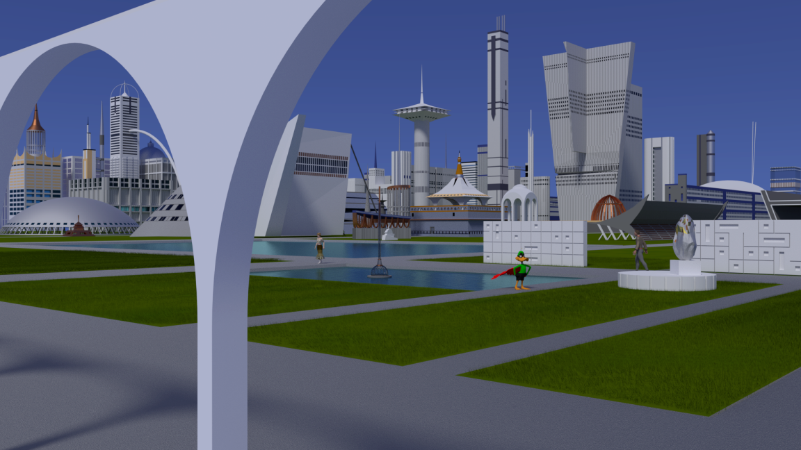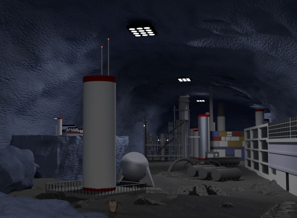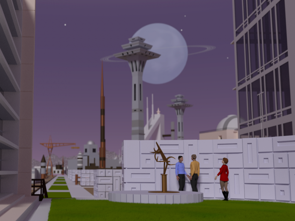Since my last post, I've done a few more, Each one is a recreation of a matte painting used for the original Star Trek series. All but the last one have an element of "whimsy" added. at the end of the post I've added some comments and notes for each image. 1. Not exactly the reception Kirk and the landing party were expecting. 2. Duck Dodgers in the 23rd and 1/2 century. 3.The "Devil" in the Dark 4. Starbase XI Note: 1. Rigel VII fortress used in "'The Cage" ( first pilot) and later seen in "The Menagerie". It was also later used for Flint's home in "Requiem For Methuselah" My first try at using the "fur" feature of Blender to simulate ground cover/vegetation. 2. Eminiar VII from "A Taste of Armageddon". This was also used as Scalos for " Wink of an Eye". While Duck Dodgers is my self-created model, the other people in the scene are posable models imported from Daz-3D. About the only modifications I made with them were in the poses and coloration of clothing. 3. Underground mining facility from The episode of the same title as the caption. This one was also later reused for "The Gamesters of Triskelion" 4. Starbase XI from "Court Martial". Again, the base figures were imported from Daz-3D, though this time I had to do a bit more to make uniforms for them to be wearing. This one also offered some additional challenges. The perspective lines in the original matter painting were not exactly consistent. So in order to keep things looking as close as possible to the painting, Some of the objects in this scene are not "square".