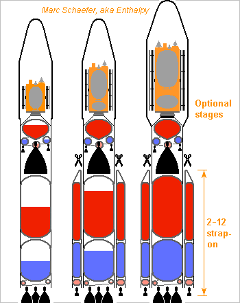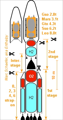 The Vinci engine exists already and is rumoured to be affordable, so here's a launcher inspired by Ariane 4 using Vinci only. The normal Vinci expander cycle, no bleeding here. 4 Vinci alone lift the launcher because the tanks aren't full. 0, 2, 3, 4 or 6 strap-on boosters add propellants and let fill the first stage. The propellant masses are: strap-on 5953kg each, first stage up to 51038kg, second stage up to 11250kg. The strap-on and first stage Vinci have a D=1.4m niobium nozzle extension for 4393m/s and 173kN (vac). A D=0.51m ablatively cooled, RD-0120 styled, jettisoned insert limits the expansion to 0.8bar for 3789m/s and 150kN (vac) or 3269m/s and 129kN (sea level). If hydrogen doesn't receive enough heat, the actively cooled divergent segment could be longer and narrower (double, triple bell?), or the chamber longer, or some exchanger be added. The second stage Vinci has D=3.0m for 4649m/s and 183kN. The dry masses are: Vinci 280kg (?), rest of the stages 360kg (each strap-on), 3062kg (first), 675kg (second). 60kg per ton of propellants result from my ballon-in-truss design scienceforums and later The widely tunable performance is given for 6 strap-ons. Hydrogen makes the same stacking efficient from Leo to Gso. Little dimension tuning, like 4.2m body instead of 4.0m, would enable 12 strap-ons, for about 1.6* the performance. The D=4.1m fairing is from Soyouz, D=5.4m from Ariane 5 and competitors, which might suffice for my sunheat engine starting with 8t ant Leo. Marc Schaefer, aka Enthalpy