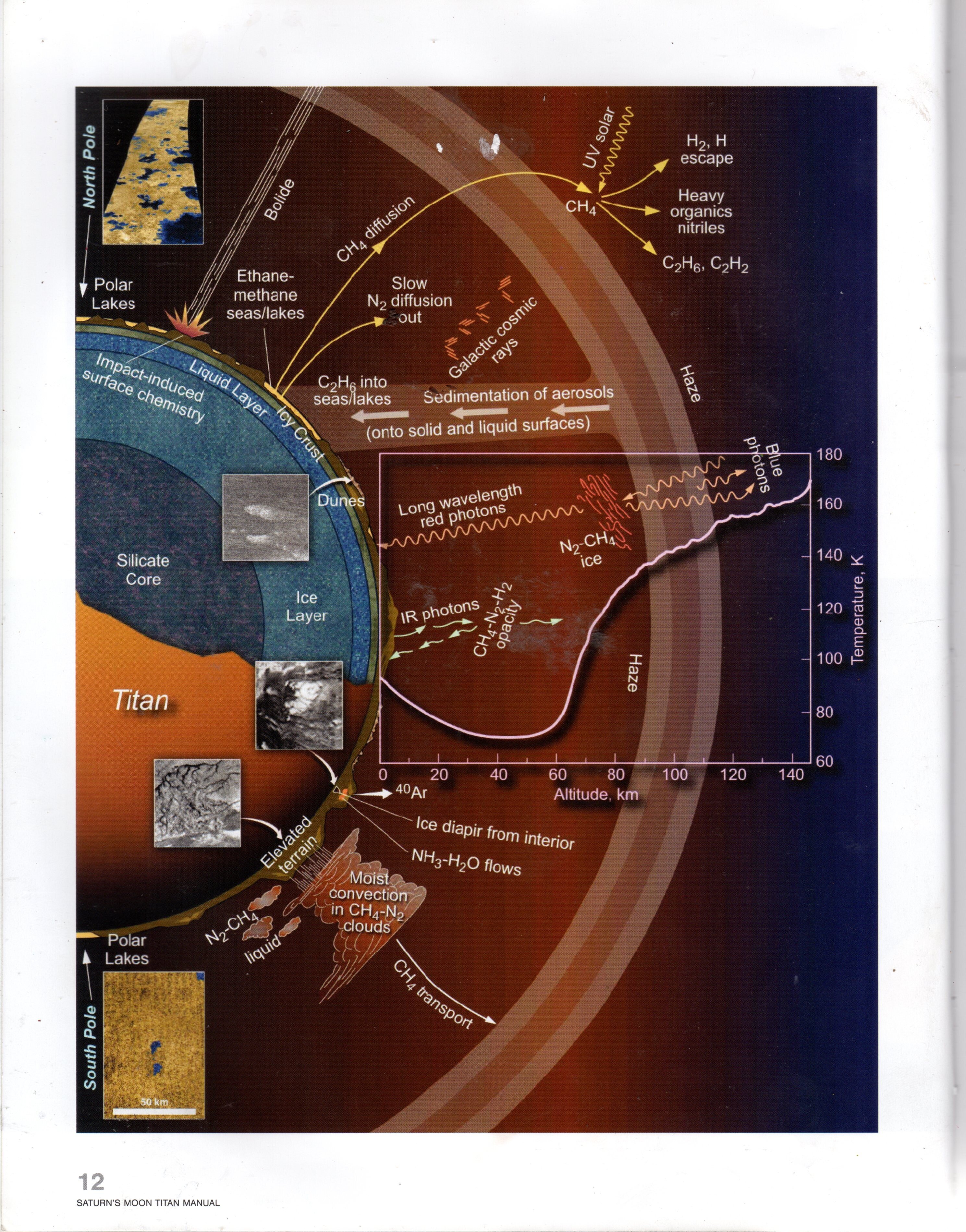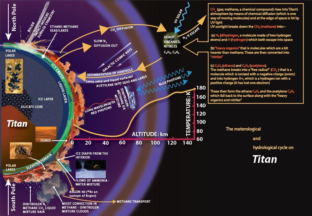 I've done my own version of a diagram of Titan's hydrological cycle (attached,) the original (also attached) being on p12 of Dr Ralph Lorenz's great book Saturn's Moon Titan: Owners' Workshop Manual. Can anyone take a look and see if I've got it right please? Im particularly concerned about what I've put in the big text box about what happens to methane diffusion when it's hit by UV rays. Looks like H2 and H escape to space, and other components are broken down and fall back to the surface, but I'm not sure. It's for a graphic design project Cheerz GIAN🙂XXX (SCIENCE AGE ABOUT 12)