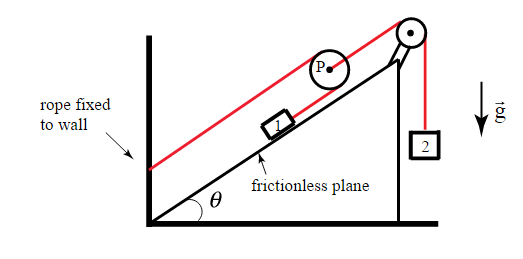 Block 1 of mass m1 slides on a frictionless plane inclined at angle θ with respect to the horizontal. One end of a massless inextensible string is attached to block 1. The string is wound around a frictionless movable pulley P of negligible mass and is also attached to the wall at the base of the inclined plane. Pulley P is connected by a second massless inextensible string to block 2 of mass m2 via a second, frictionless pulley that is fixed in place. Block 2 hangs over the end of the inclined plane (see figure). The downward gravitational acceleration is g.