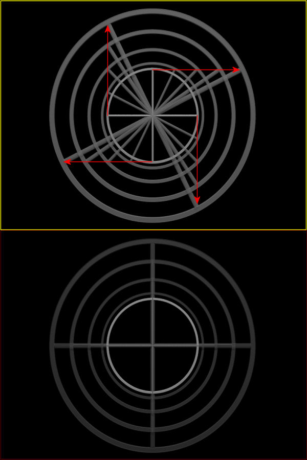The bottom image shows the same scenario but from a frame that was rotating with the station. If you plot the position of the end of the spoke over time, you get a spiral-like arc.( though the spokes themselves remain straight.)