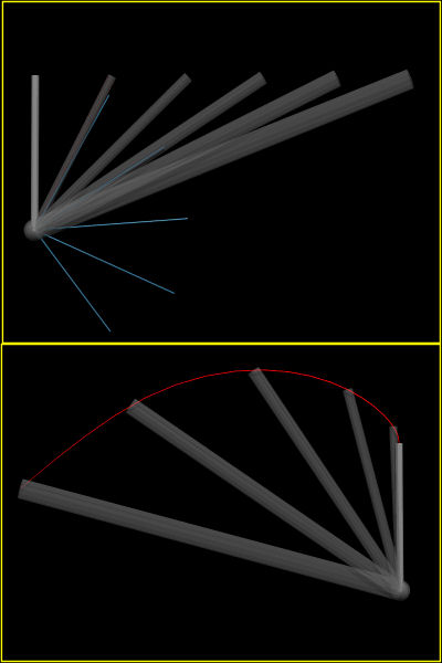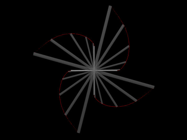 The straight-up spoke is represents the moment the magnets release and each of the others is the same spoke at different moments in time. The thin lines represent the center-line of the spoke if it had continued to rotate around the axis.