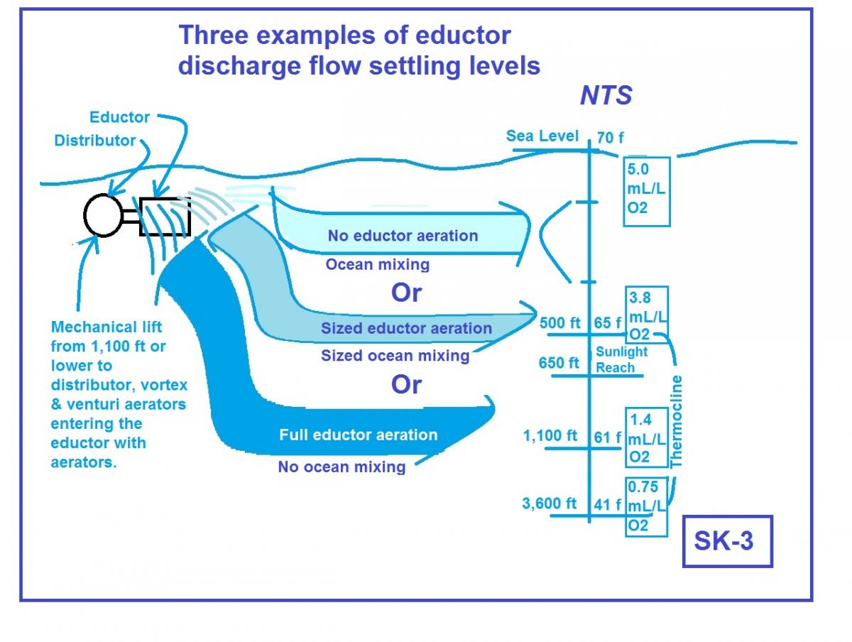 The system will have 6 eductors and 3 eductors on one side can be set for discharge to sunlight reach depth and 3 on the other side can be set for settling in the thermocline. Note, to settle at the thermocline the eductor has to have full aeration so there is no ocean water mixing and water temperature will be close to thermocline water temperature of 1,100 ft */-.