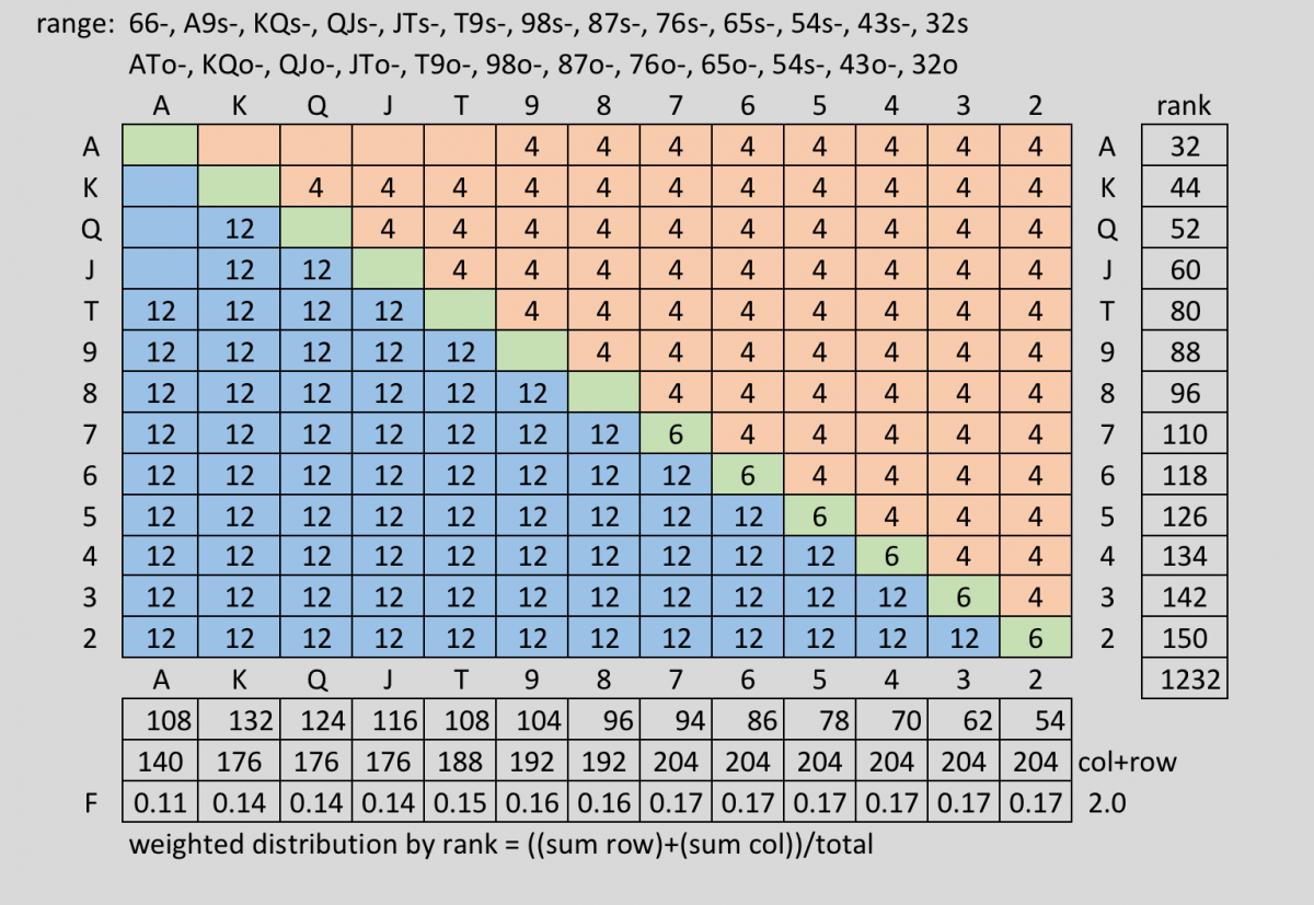 That range could then be reduced to an average weighted distribution of card ranks within two cards as demonstrated below using a hand matrix in Excel: