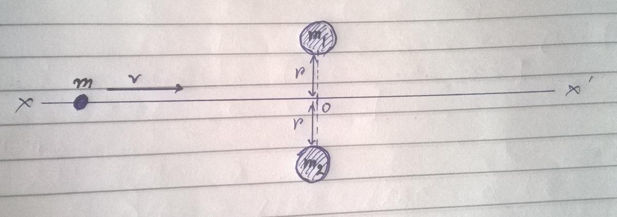 Suppose that there's a body of mass m moving with uniform velocity of v in the horizontal direction of XX' ( see diagram). There are two massive bodies m1 and m2 which lie at a distance of r from centre O. So, as the body moves, the two bodies will influence its course of motion due to gravity.