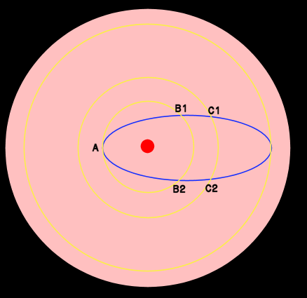 The red circle is Sag A, the larger pink circle is the extra mass distributed around Sag A. The Blue ellipse is S2's orbit. At point A,the mass effecting S2's trajectory is that of Sag A plus that part of the extra mass closer to Sag A than it is (enclosed by the innermost yellow circle. At either of the points B it is Sag A plus the mass enclosed by the next yellow circle. The same holds for points C and D. Thus as S2 moves in and out from Sag A in its orbit, the mass effecting it changes. This causes a departure from a Keplerian Eclipse in a number of ways.