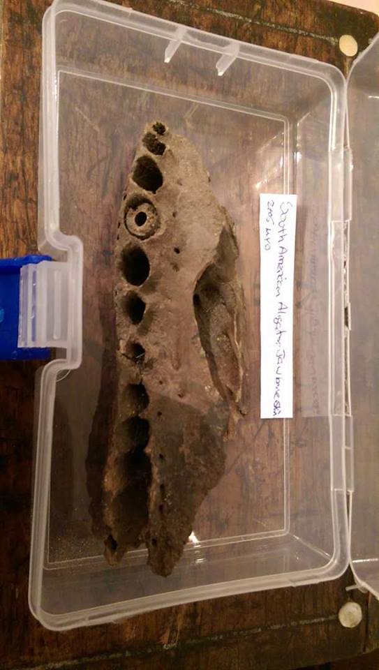 Here is the Hadrosaur fetus and bone bits - 135 myo from Utah. Also a couple of pieces of Sauropod vertebrae from the UK and an Iguanodon claw and bone. Then an alligator jaw bone from South America, 3 to 5 myo. Then there is the box with the lepidoes head, it's flank and other fish bits up to 160 myo. Also some other fossils - ammonites, some trilobites and a segnesosaur dinosaur egg.
