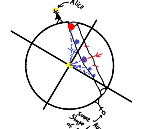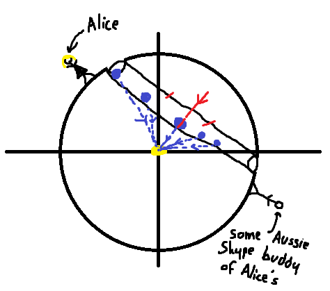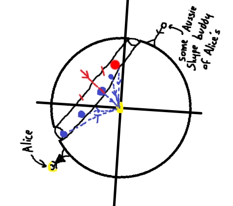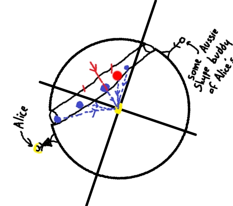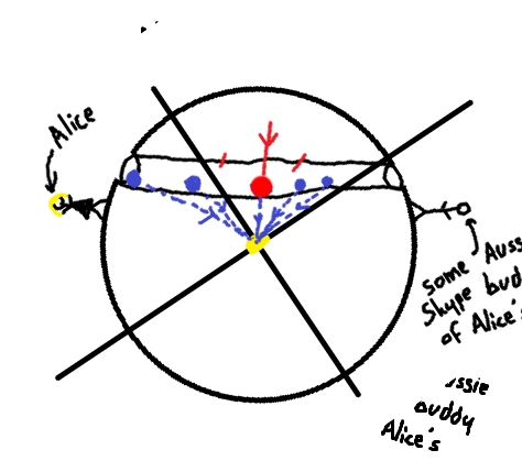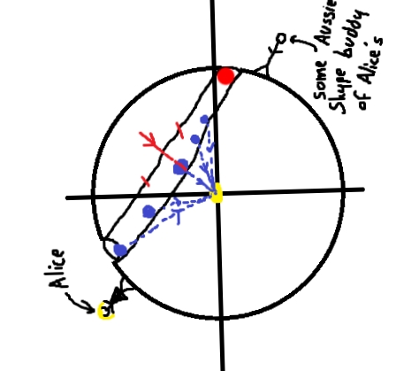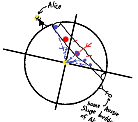 So imagine the ball rolling towards the Aussie guy. If we watch the world from his perspective, the ball can roll down again towards Alice.