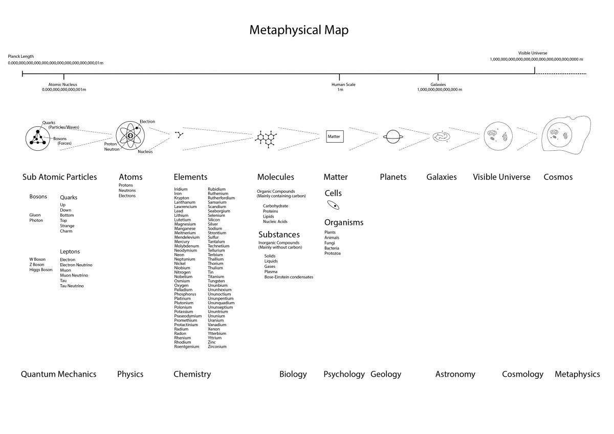 Basically I was trying to provide a simple diagram of how the smallest and largest things known to humanity fit together, the best way I could imagine was a reductionist approach to try and describe the constituent parts of each system starting form the largest to the smallest or vice versa