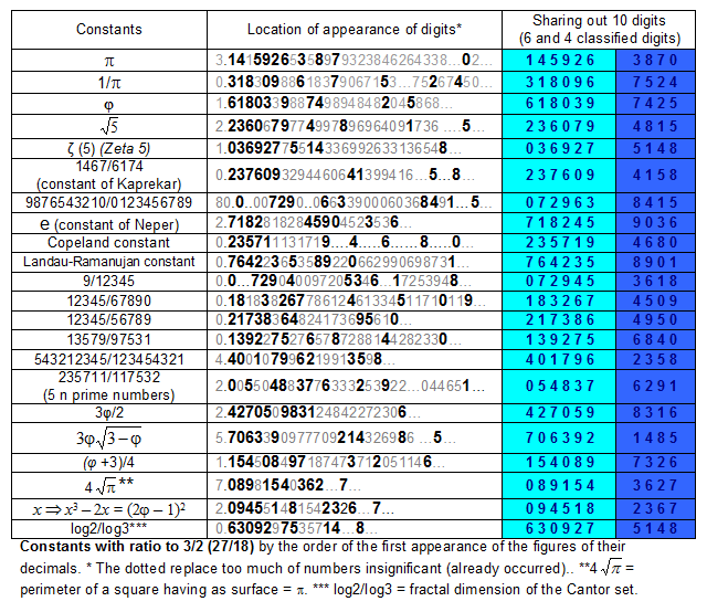 (excerpt from the paper)...Into the occurrence order of digits of their decimals, the constants 1/π and 1/φ have the same ratio to 3/2 (probability to 1/11. 66).