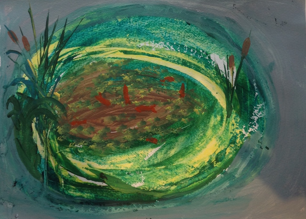 It is aware of its bugs on the base of the pool , and imagines there must be more of ' the feeder' creatures up there beyond the surface of the water ( it's sky ) . I wonder where they come from , a long long way away ? Do they live in water , did they build my world and put me and my fellow fishes in this pool . Did they make all these plants around me ?
