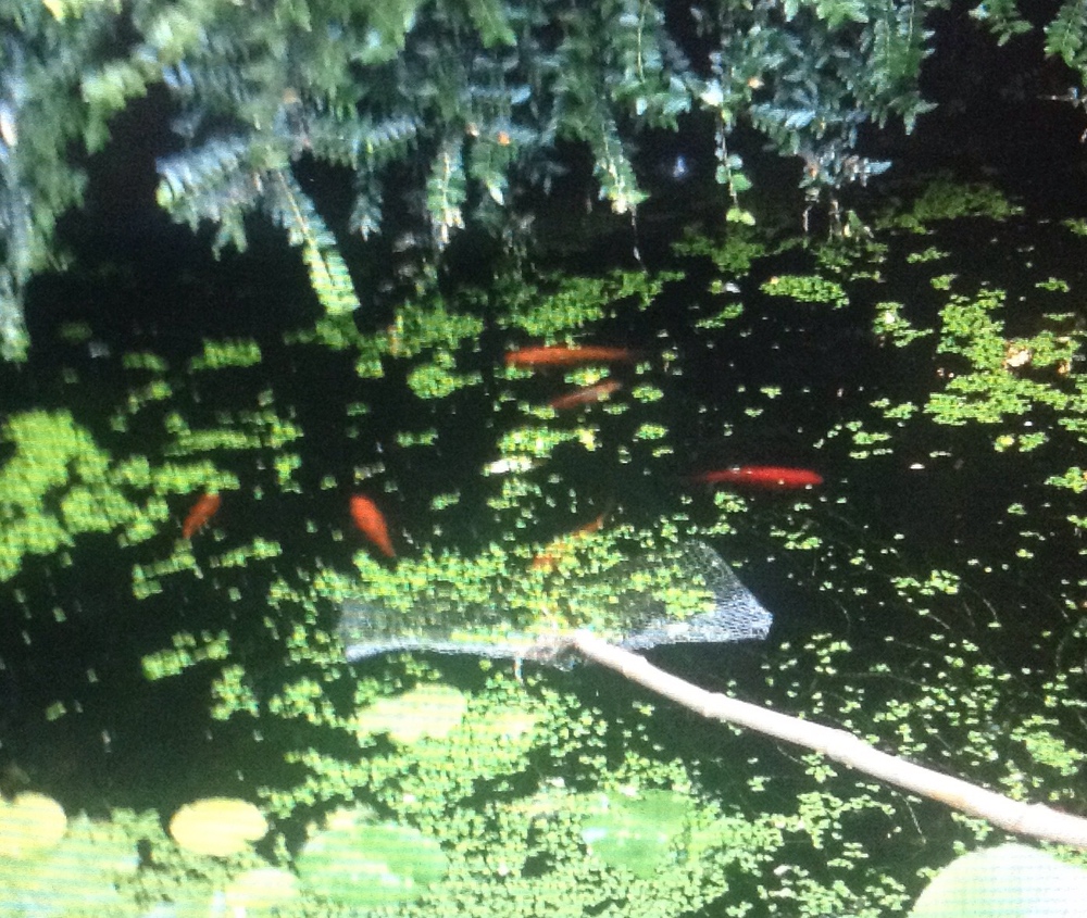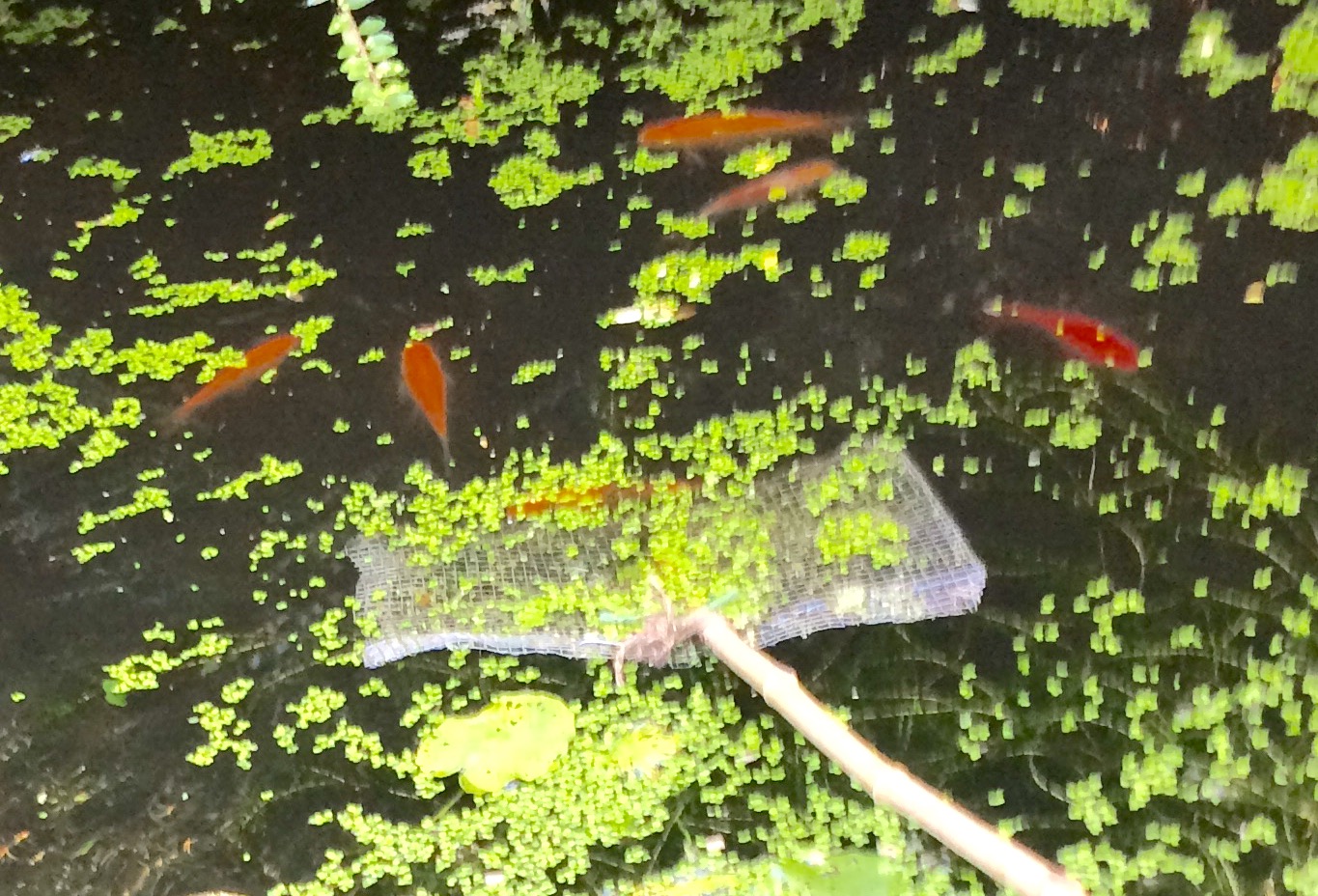 Note ,  in the following photograph of my pushing a metal mesh weed collector into the pool in their immediate proximity . They are NOT FREAKED, or swim away , they are familiar with me , my periodic intervention , and appear to enjoy it and swim with the flow of the net !