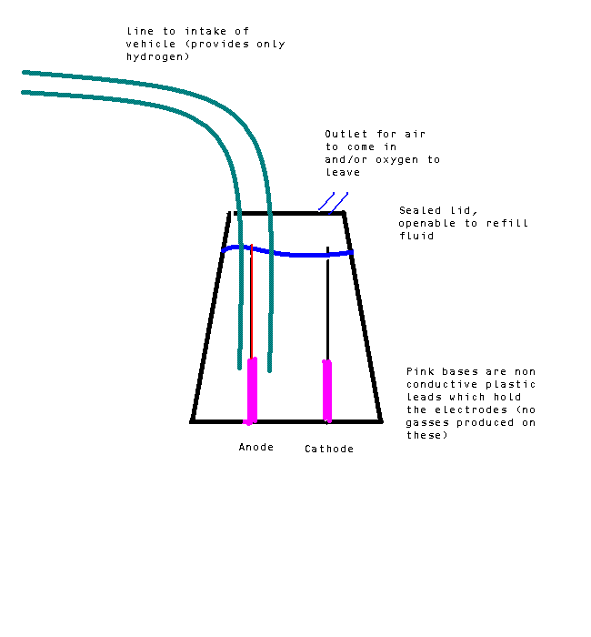 In response to the previous response, I know what you mean, but that would require redesigning the electrolysis apparatus. It's currently built so that the electrodes are positive and the stainless steel container is grounded. The electrodes hang from a stainless steel cap at the top which also holds an outlet for the gas to be transfered into a vacuum line of the engine.