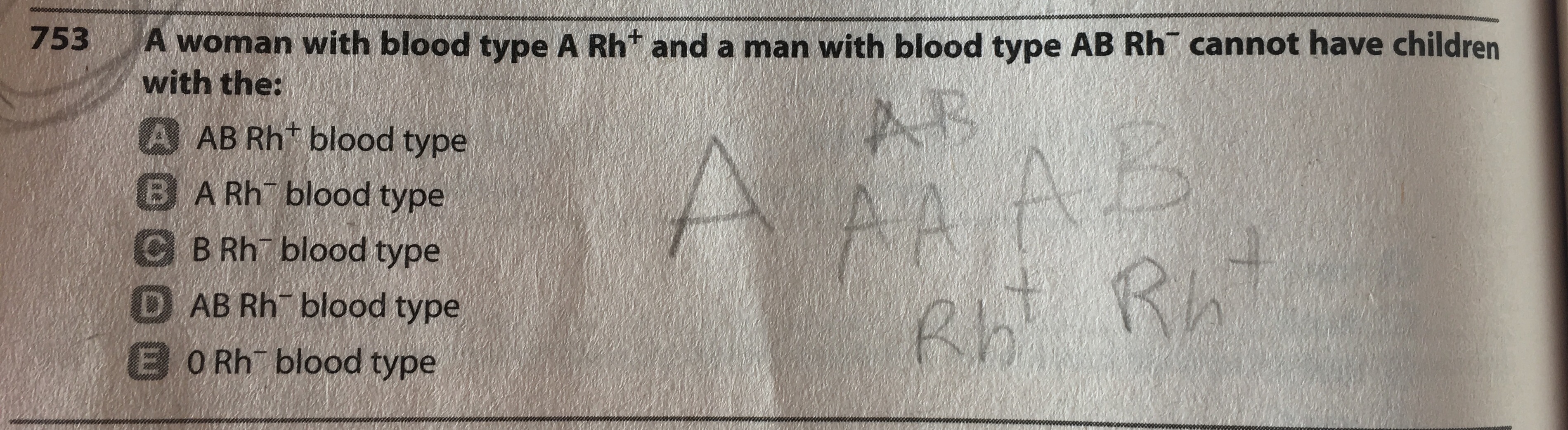 Oh gotcha , Well I thought it was the number A, since Rh + is dominant and Rh- recessive, and all the other answers have the rh- .. but it's actually 0 Rh- (E) so I don't understand how it's inherited.