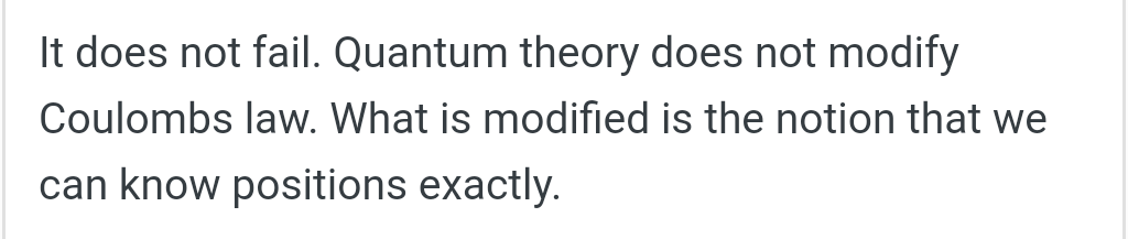 It does not fail. Quantum theory does not modify Coulombs law. What is modified is the notion that we can know positions exactly.
