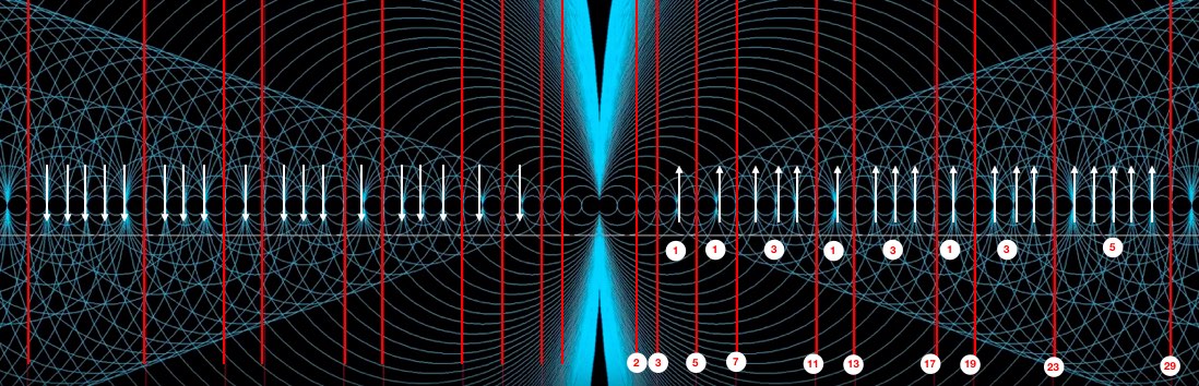 The primes are perpendicular to electric field waves 4 and 6… and the waves “weave” in an out with the primes between 2 field lines.