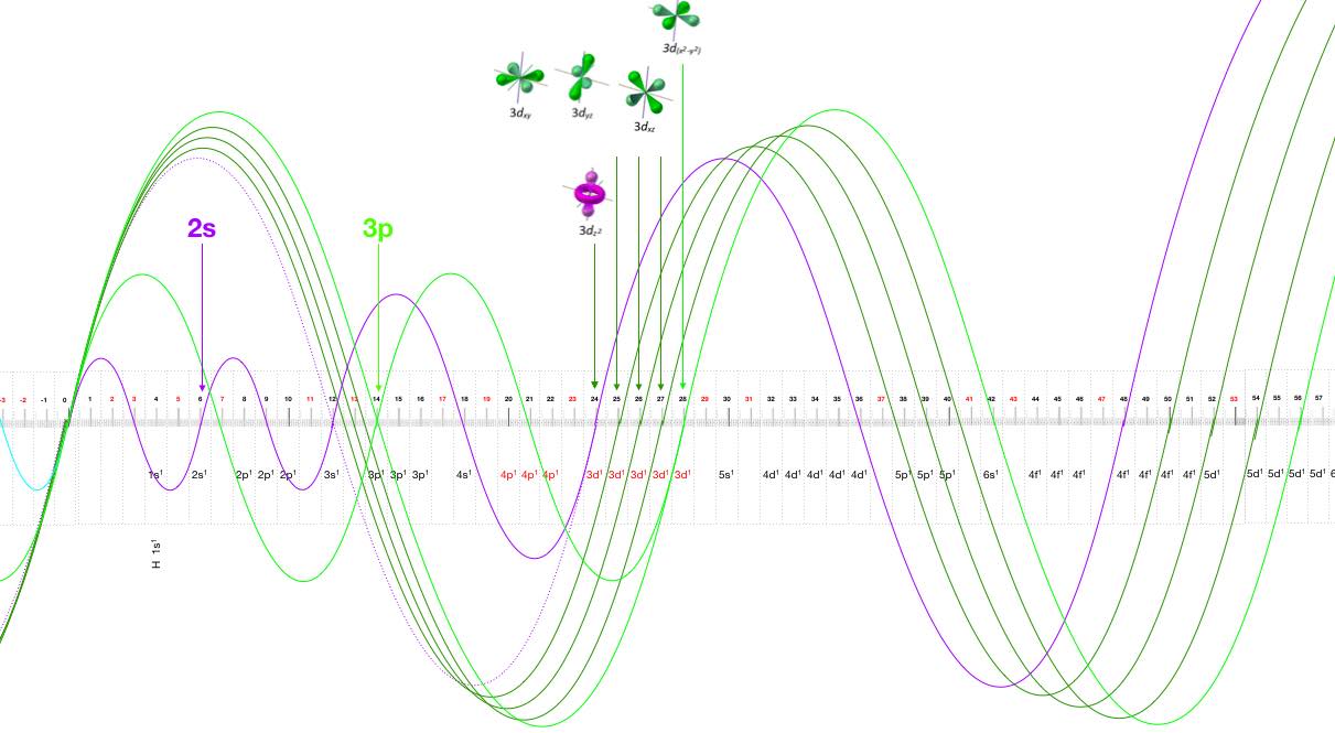 I have not done the f orbitals yet… BUT the 3d have an interesting arrangement with 2 of the 5 coming from previous axis and 3 new axis so you would expect to see 3 new waves at 3d - xy, yz and xz which you do…