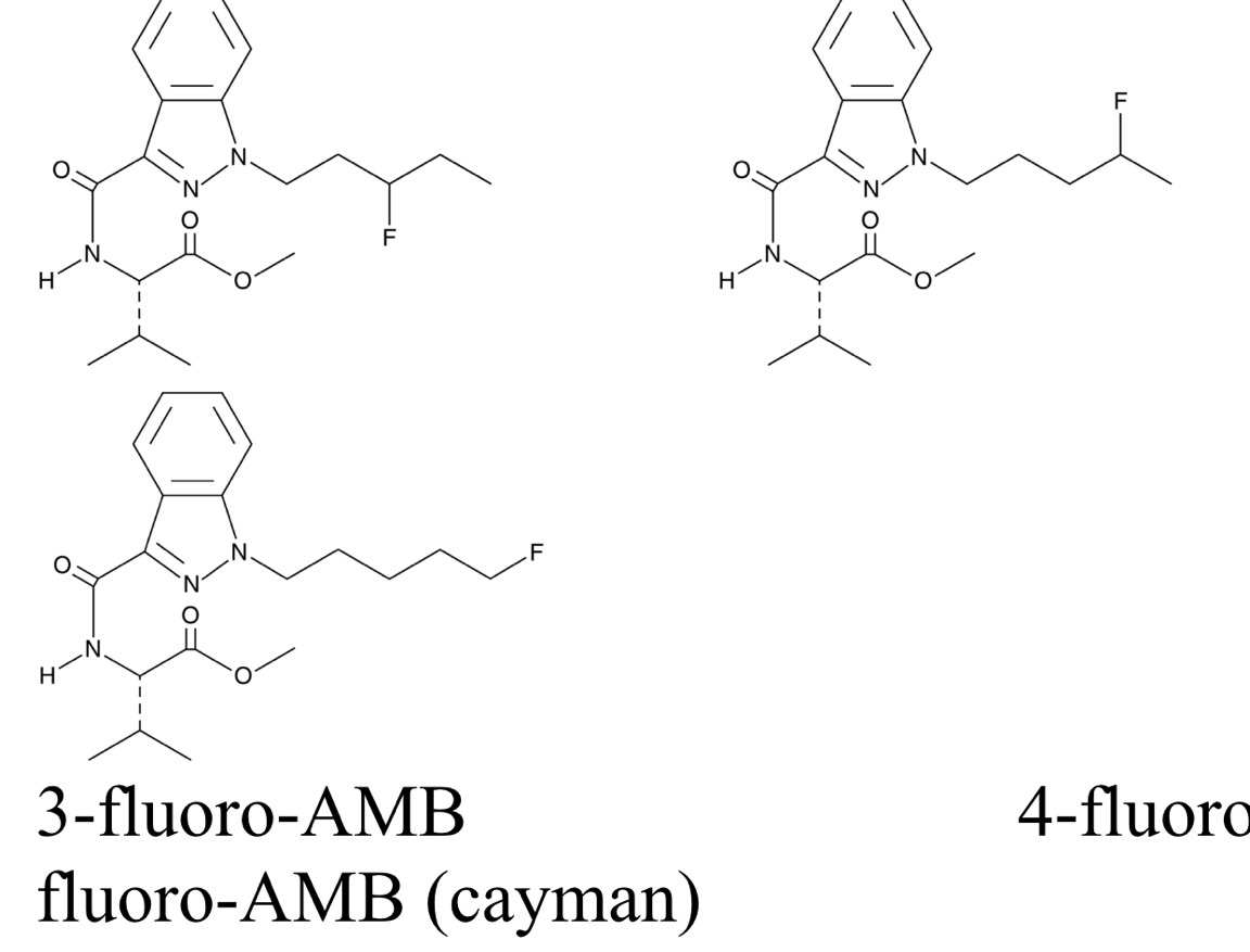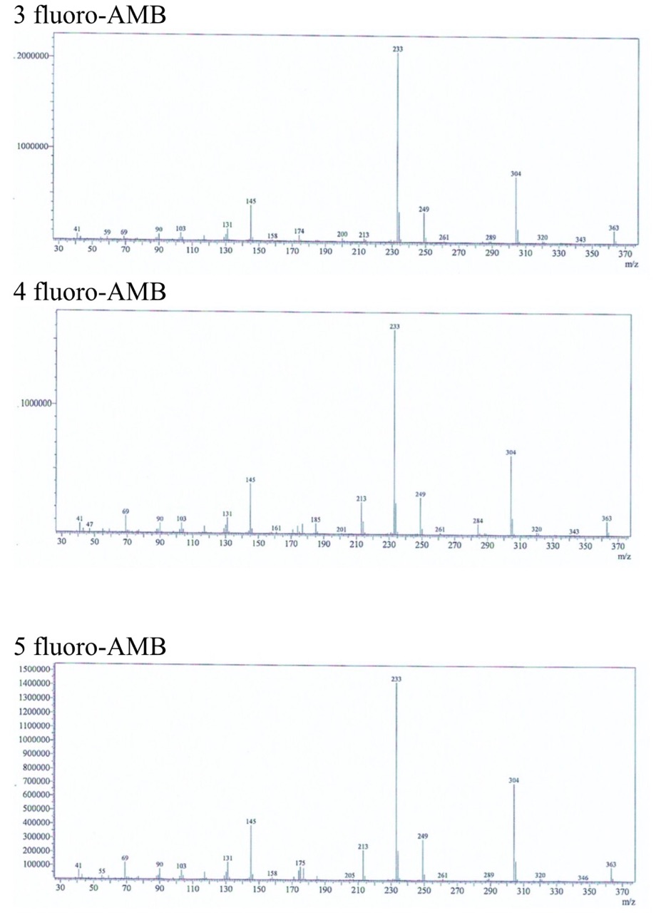 I have these three compounds with a Fluorine attached to different carbons. If you look at the chromatograph, two of the Fluorine peaks (the 213) are relatively the same size, however one of the compounds the fluorine does not come off as readily (3-fluoro-AMB). I've been researching on why this is occuring for that compound. Can anyone lead me in the right direction?