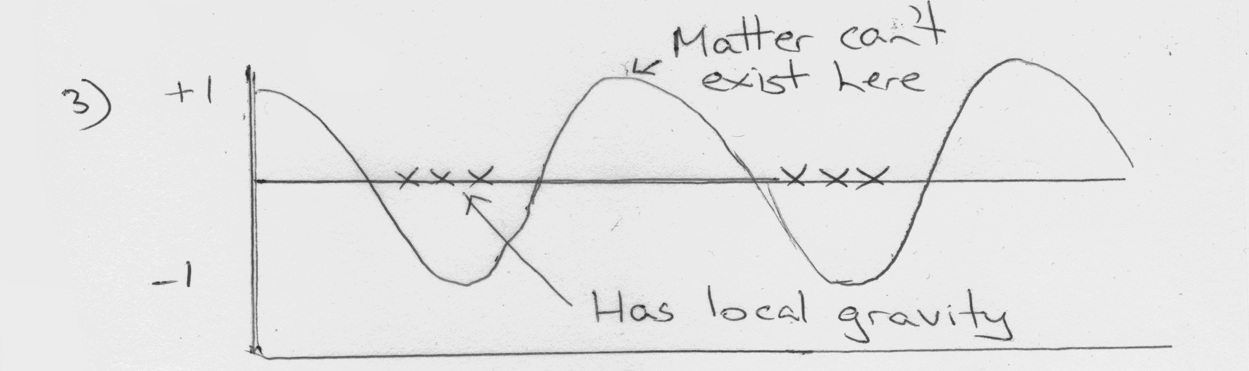 Superimposed onto this wave is the universal plane. This is where matter exists. The value of the gravity along this line corresponds to the value of the sine wave at that point.