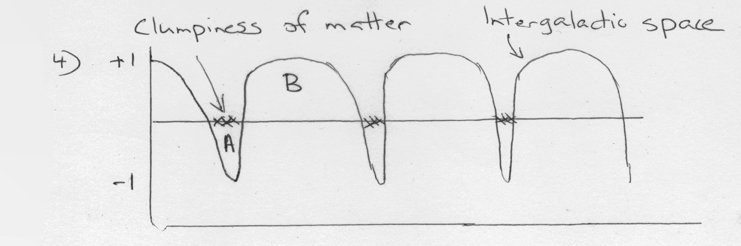 Fig 4. Because matter has its own intrinsic gravity different to Mike's gravity (A), it will act to curve space in this region further. This will cause trough walls in A to close together.