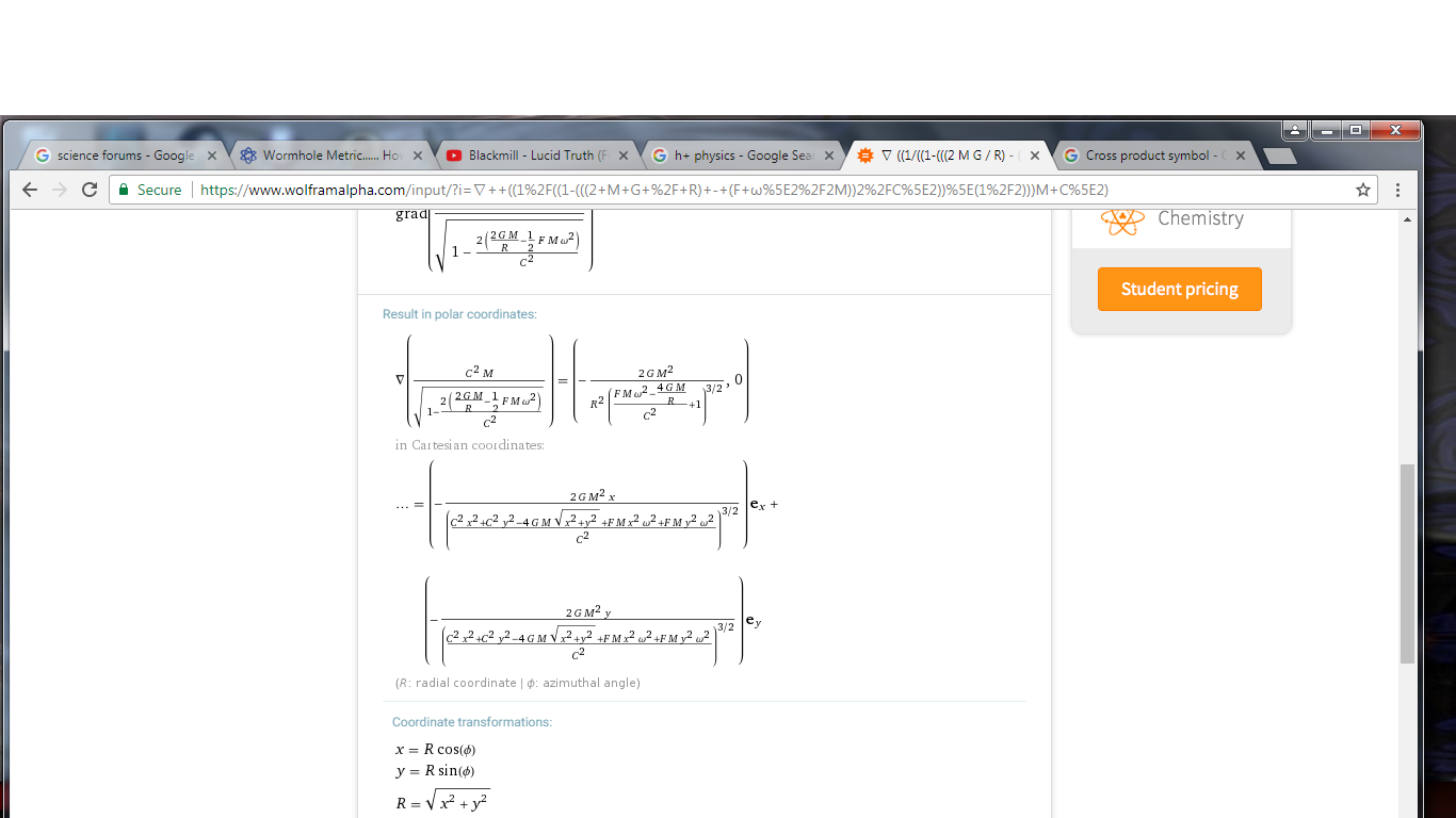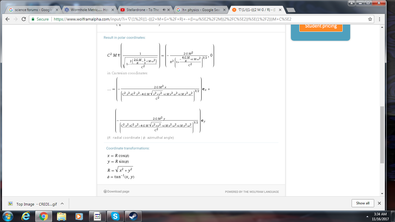 Then Wolfram Alpha cannot compute (∇^2)(1/((1-(((2 M G / R) - (I ω^2/2M))^2/C^2))(1/2)))MC^2 or ∇'(x',y',z') or ∇(1-(((2MbG / Rs) - (Isωs2/2Mb))2/C2))1/2  and doesn't understand  2(1-(((2MbG / Rs) - (Isωs2/2Mb))2/C2))1/2 , so I guess it falls to me.