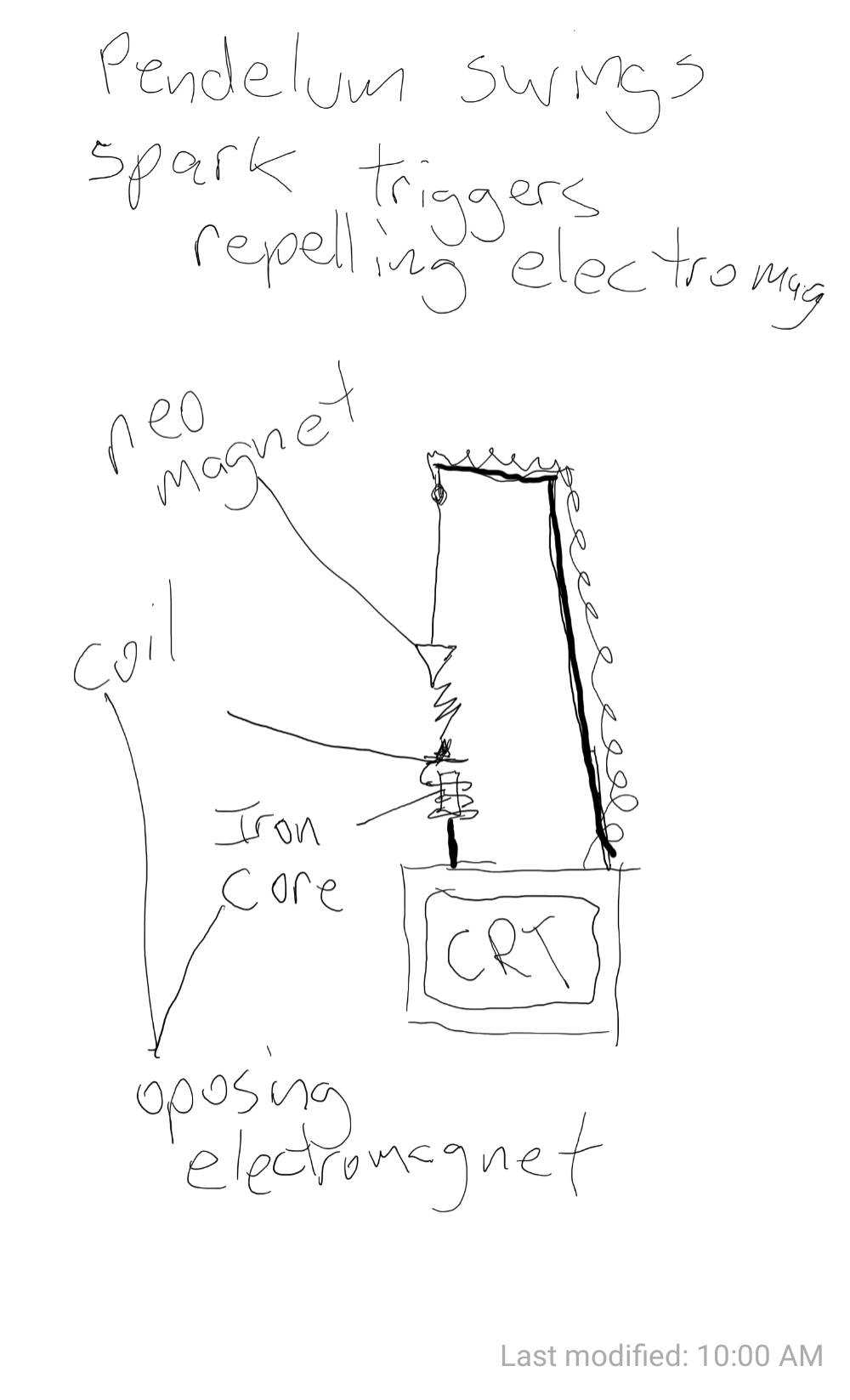 I want to power a pendulum with a magnet on the tip. The push will be a base electromagnet that triggers on when the pendulum reaches near equilibrium position. The high voltage lead will be connected to the pendulum. The switch will be the close proximity to ground which will be centered beneath.