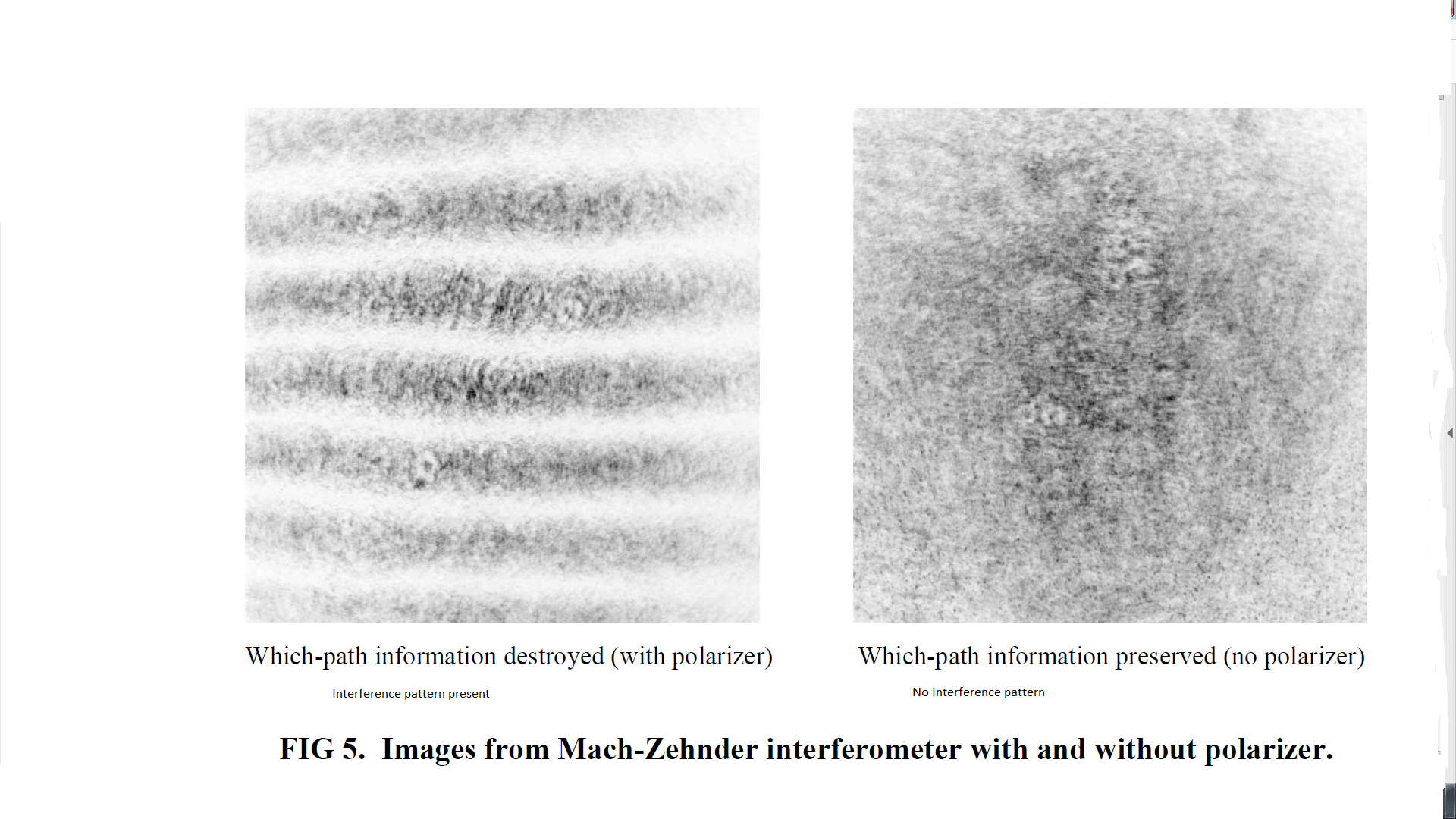 "We observed that without a polarizer no interference pattern was observed because light exiting the interferometer contained which-path information." p.6