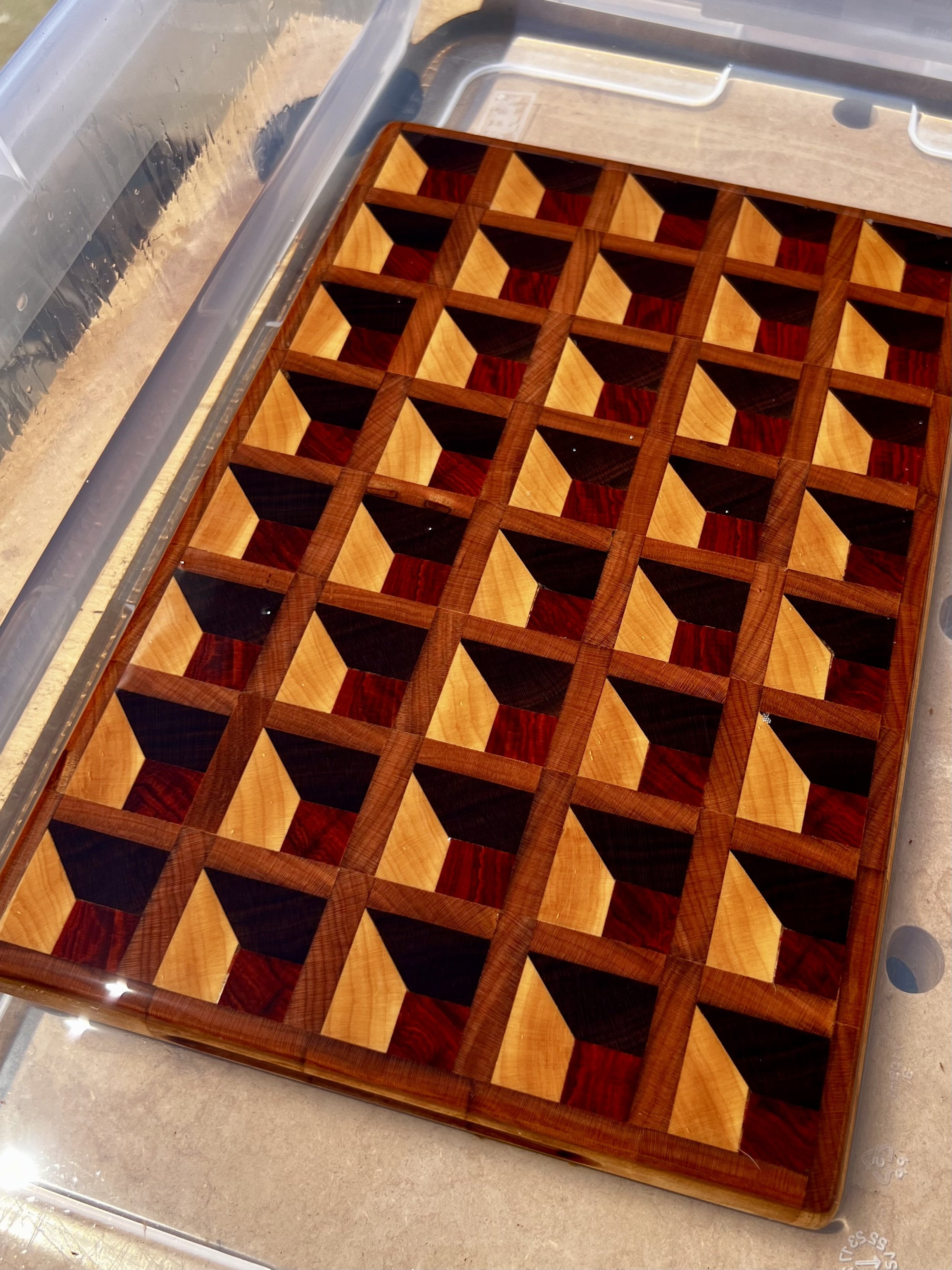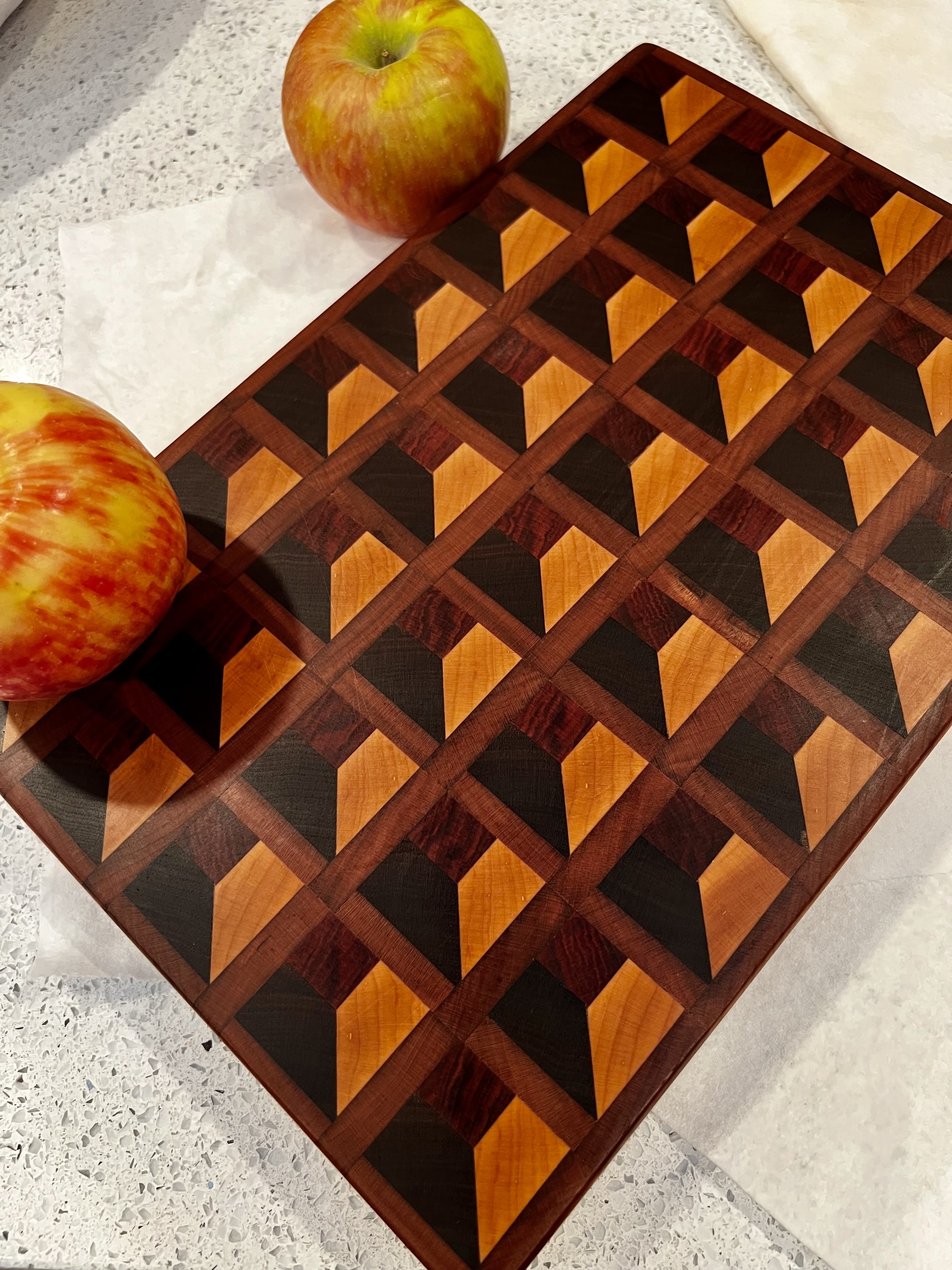 Built another end grain cutting board. Gave several of various designs out as gifts over the holidays, but think I’ll keep this one for our own kitchen bc I really like the optical illusion.